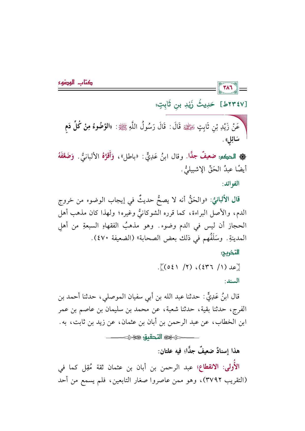 قال الألبانيُّ: "والحَقُّ أنه لا يصحُّ حديثٌ في إيجاب الوضوء من خروج الدم، والأصل البراءة، كما قرره الشوكانيُّ وغيره؛ ولهذا كان مذهب أهل الحجاز أن ليس في الدم وضوء. وهو مذهبُ الفقهاءِ السبعةِ من أهلِ المدينةِ. وسَلَفُهم في ذلك بعض الصحابة" (الضعيفة ٤٧٠).