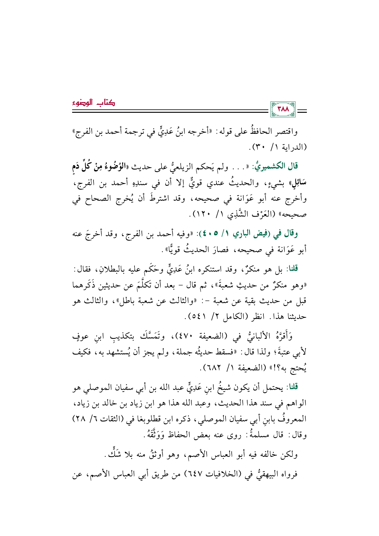 قال الكشميريُّ: " ... ولم يَحكم الزيلعيُّ على حديث ((الوُضُوءُ مِنْ كُلِّ دَمٍ سَائِلٍ)) بشيءٍ، والحديثُ عندي قويٌّ إلا أن في سندِهِ أحمد بن الفرج، وأخرج عنه أبو عَوَانة في صحيحه، وقد اشترطَ أن يُخرج الصحاح في صحيحه" (العَرْف الشَّذِي ١/ ١٢٠).