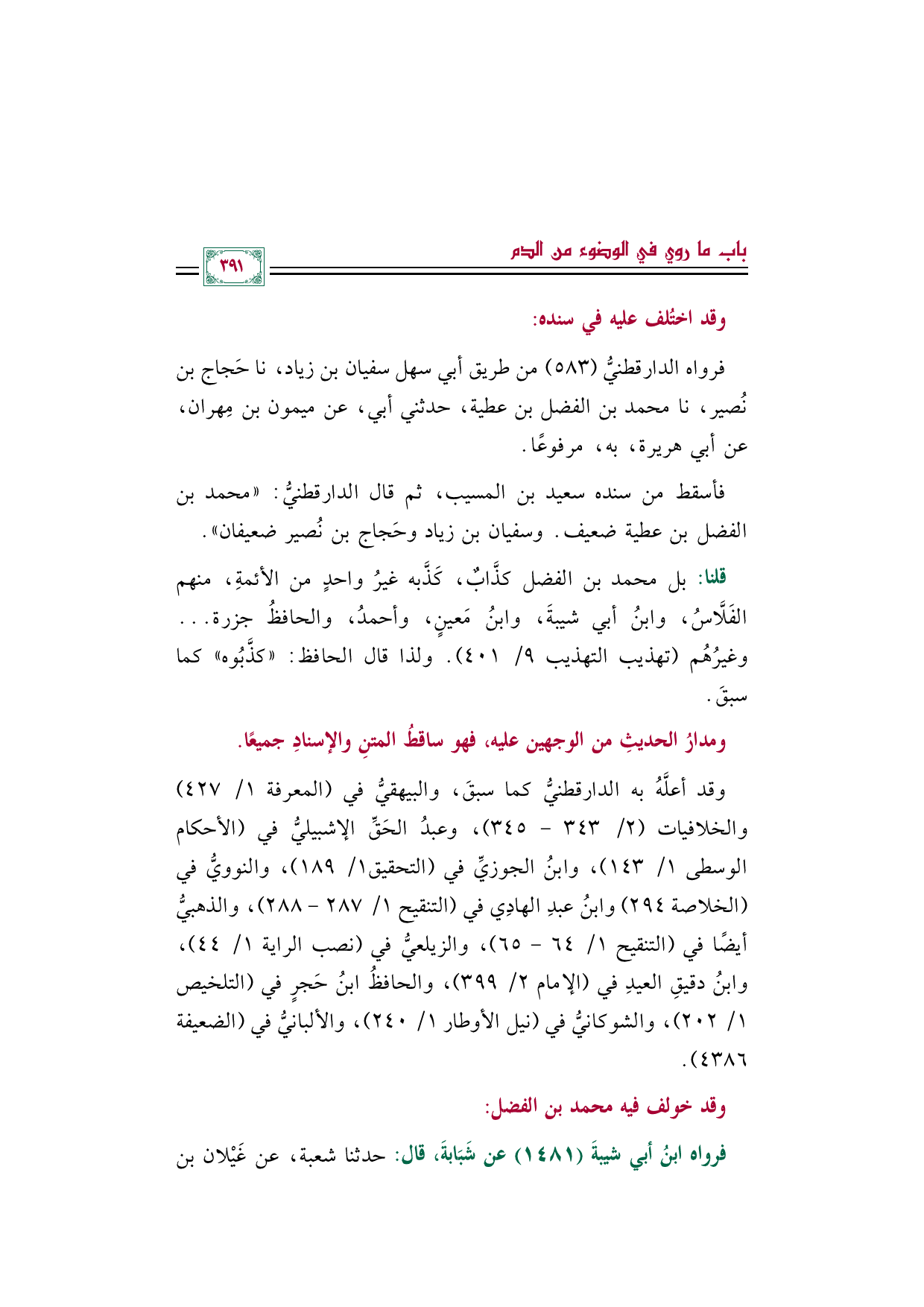 فأسقط من سنده سعيد بن المسيب، ثم قال الدارقطنيُّ: "محمد بن الفضل بن عطية ضعيف. وسفيان بن زياد وحَجاج بن نُصير ضعيفان".