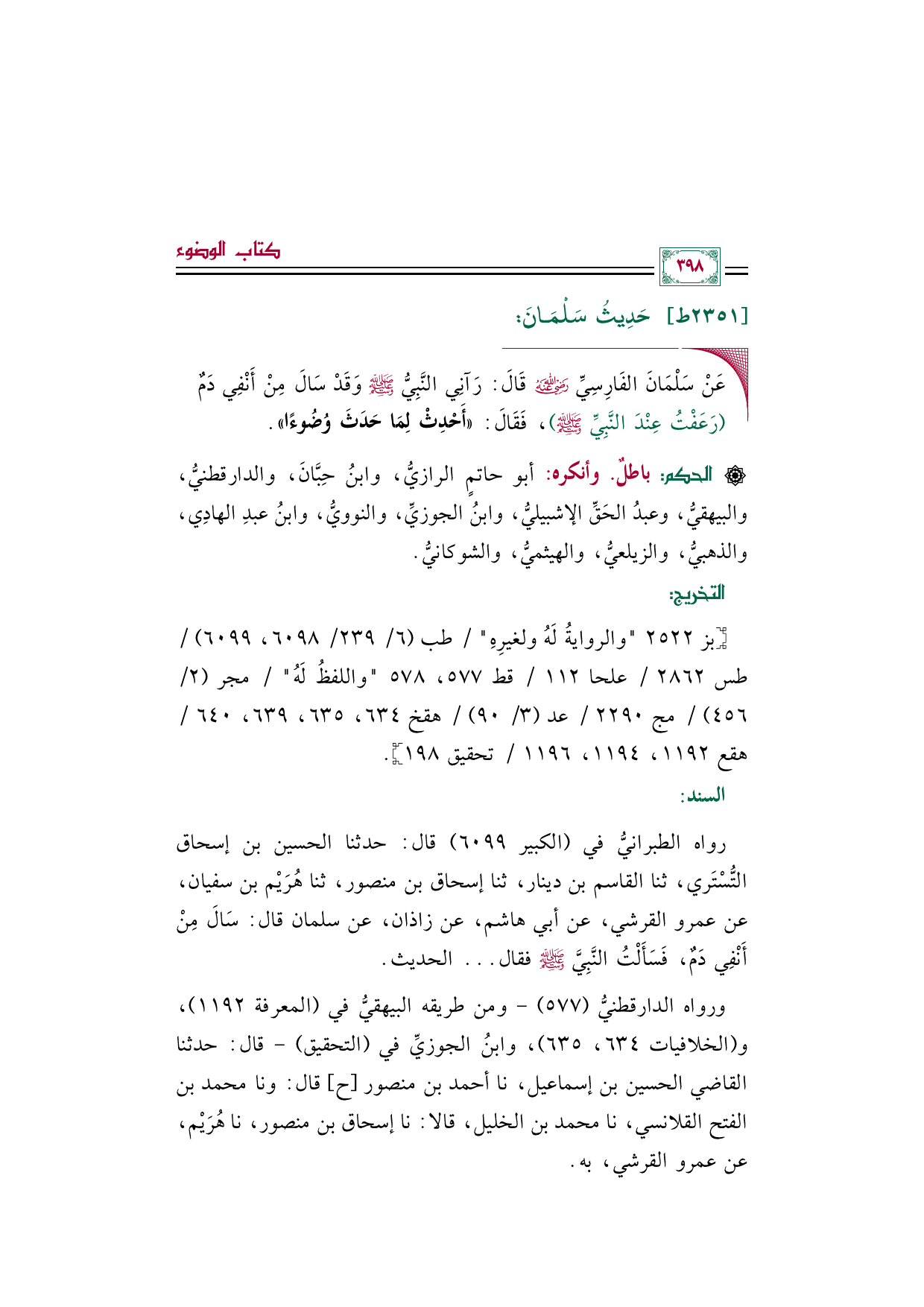 ◼ عَنْ سَلْمَانَ الفَارِسِيِّ رضي الله عنه قَالَ: رَآنِي النَّبِيُّ صلى الله عليه وسلم وَقَدْ سَالَ مِنْ أَنْفِي دَمٌ (رَعَفْتُ عِنْدَ النَّبِيِّ صلى الله عليه وسلم)، فَقَالَ: ((أَحْدِثْ لِمَا حَدَثَ وُضُوءًا)).