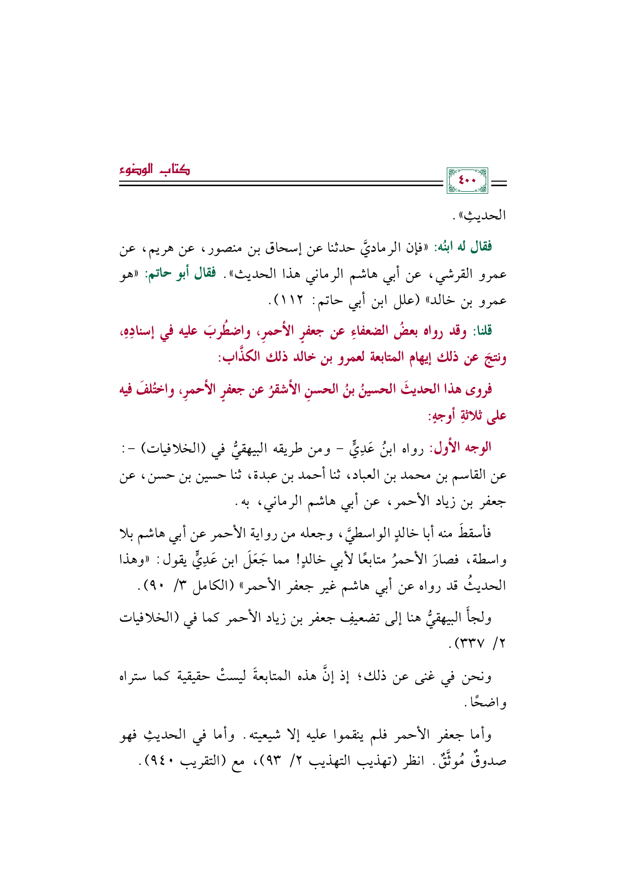 فأسقطَ منه أبا خالدٍ الواسطيَّ، وجعله من رواية الأحمر عن أبي هاشم بلا واسطة، فصارَ الأحمرُ متابعًا لأبي خالدٍ! مما جَعَلَ ابن عَدِيٍّ يقول: "وهذا الحديثُ قد رواه عن أبي هاشم غير جعفر الأحمر" (الكامل ٣/ ٩٠).