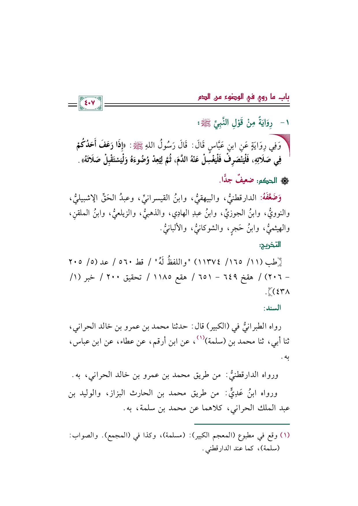 رواه الطبرانيُّ في (الكبير) قال: حدثنا محمد بن عمرو بن خالد الحراني، ثنا أبي، ثنا محمد بن (سلمة) (¬١)، عن ابن أرقم، عن عطاء، عن ابن عباس، به.