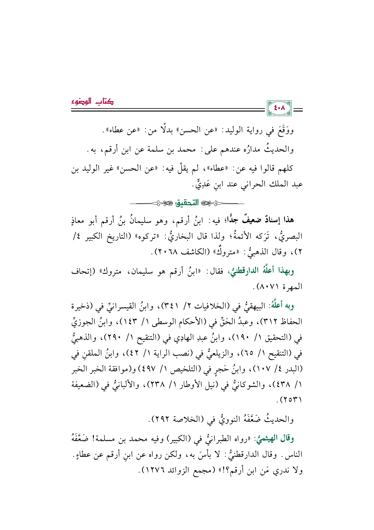 وقال الهيثميُّ: "رواه الطبرانيُّ في (الكبير) وفيه محمد بن مسلمة! ضَعَّفَهُ الناس. وقال الدارقطنيُّ: لا بأسَ به، ولكن رواه عن ابنِ أرقم عن عطاءٍ. ولا ندري مَن ابن أرقم؟ ! " (مجمع الزوائد ١٢٧٦).