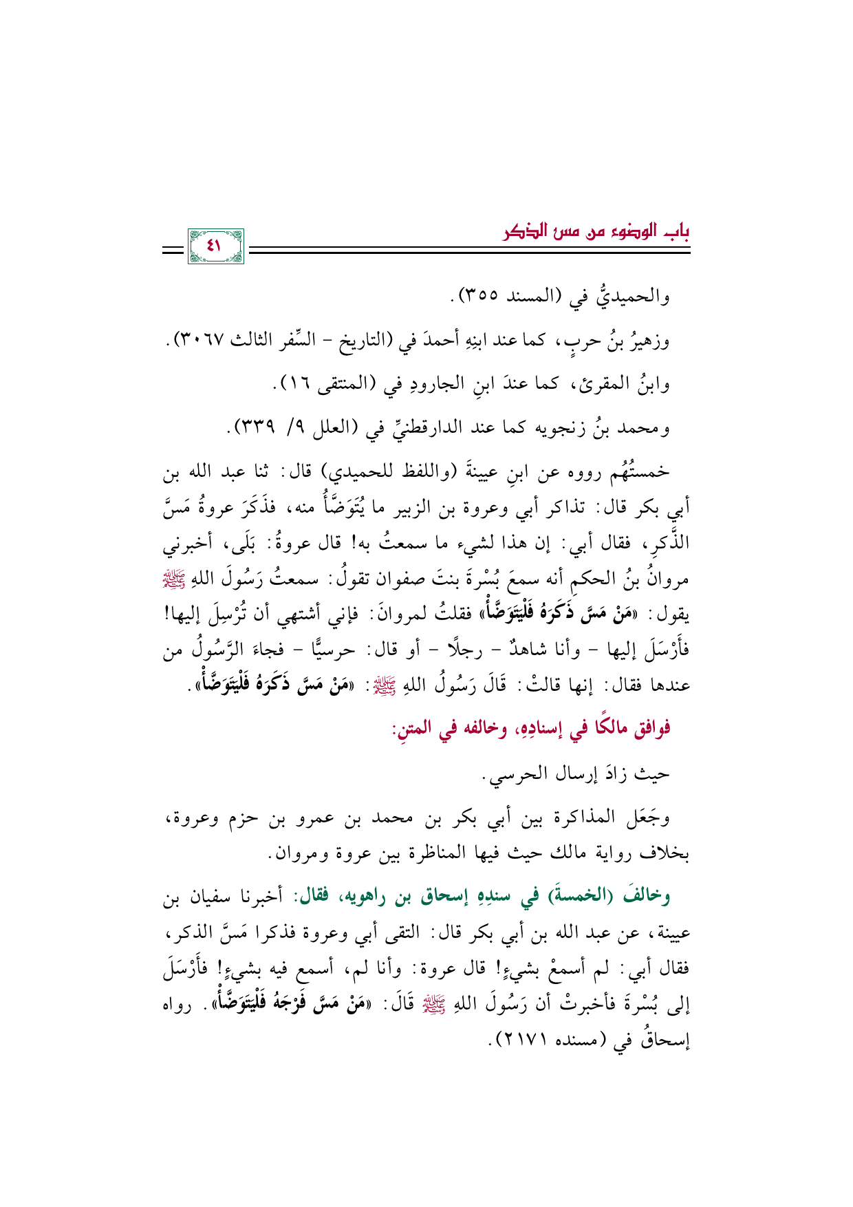 خمستُهُم رووه عن ابنِ عيينةَ (واللفظ للحميدي) قال: ثنا عبد الله بن أبي بكر قال: تذاكر أبي وعروة بن الزبير ما يُتَوَضَّأُ منه، فذَكَرَ عروةُ مَسَّ الذَّكرِ، فقال أبي: إن هذا لشيء ما سمعتُ به! قال عروةُ: بَلَى، أخبرني مروانُ بنُ الحكمِ أنه سمعَ بُسْرةَ بنتَ صفوان تقولُ: سمعتُ رَسُولَ اللهِ صلى الله عليه وسلم يقول: ((مَنْ مَسَّ ذَكَرَهُ فَلْيَتَوَضَّأْ)) فقلتُ لمروانَ: فإني أشتهي أن تُرْسِلَ إليها! فأَرْسَلَ إليها -وأنا شاهدٌ- رجلًا -أو قال: حرسيًّا- فجاءَ الرَّسُولُ من عندها فقال: إنها قالتْ: قَالَ رَسُولُ اللهِ صلى الله عليه وسلم: ((مَنْ مَسَّ ذَكَرَهُ فَلْيَتَوَضَّأْ)).