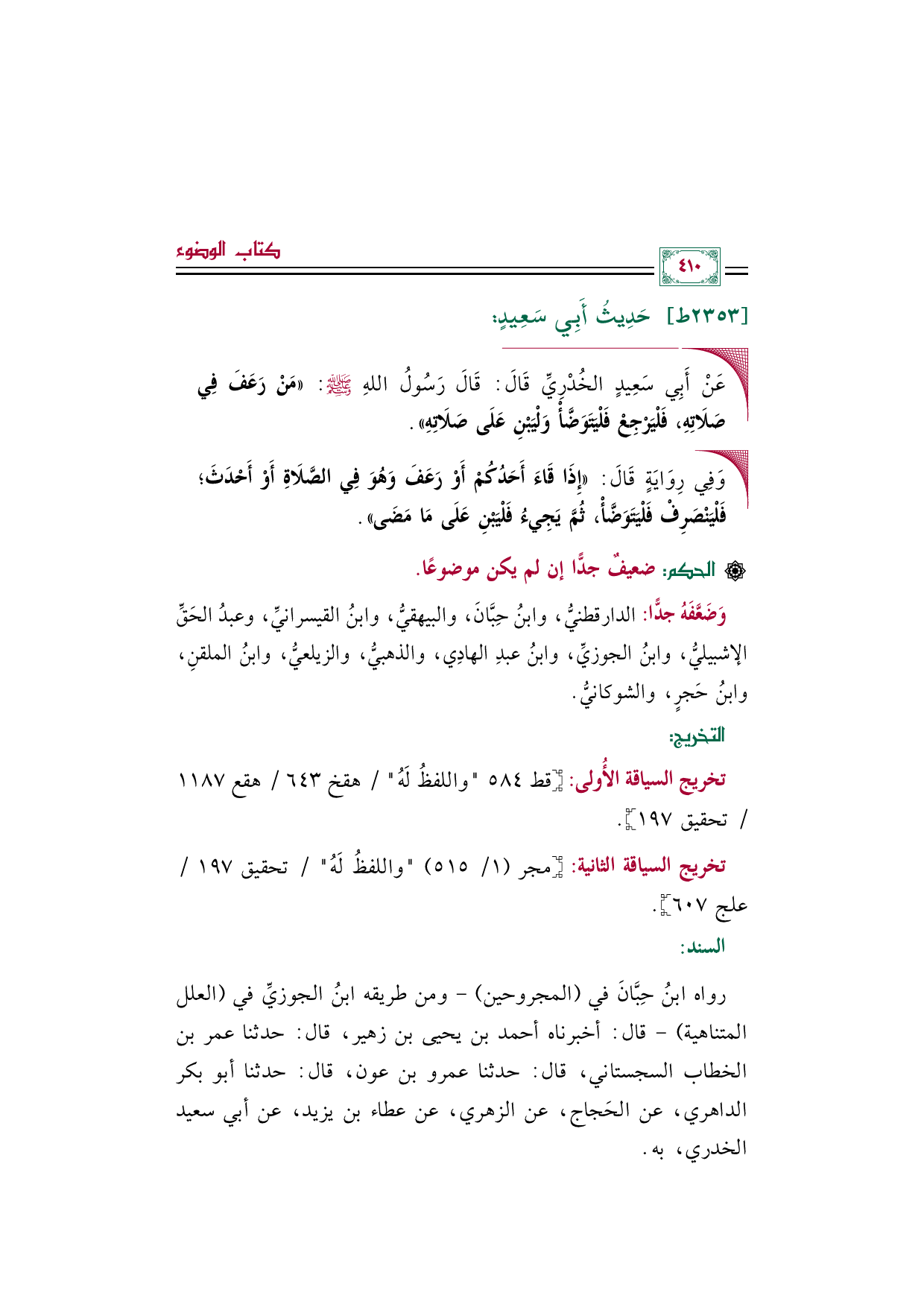 ◼ عَنْ أَبِي سَعِيدٍ الخُدْرِيِّ قَالَ: قَالَ رَسُولُ اللهِ صلى الله عليه وسلم: ((مَنْ رَعَفَ فِي صَلَاتِهِ، فَلْيَرْجِعْ فَلْيَتَوَضَّأْ وَلْيَبْنِ عَلَى صَلَاتِهِ)).