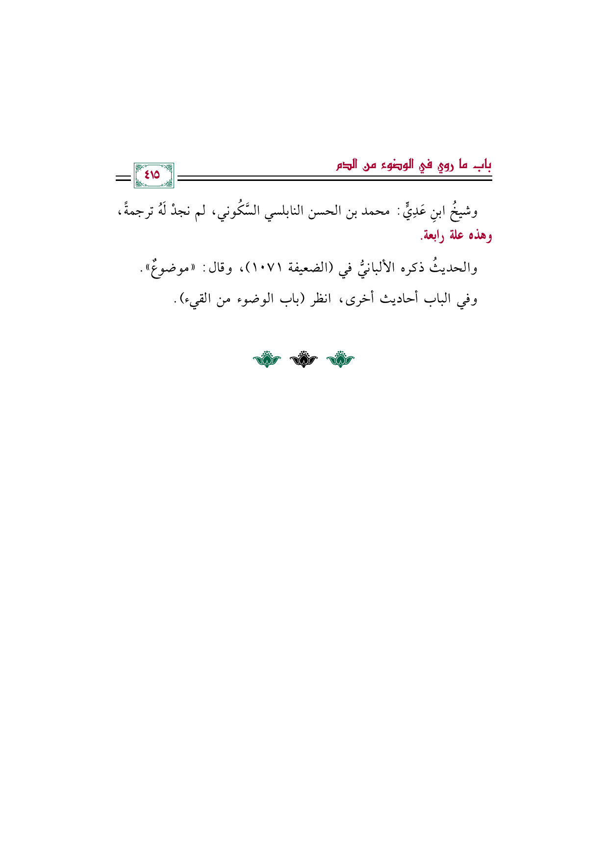 وشيخُ ابنِ عَدِيٍّ: محمد بن الحسن النابلسي السَّكُوني، لم نجدْ لَهُ ترجمةً، وهذه علة رابعة.