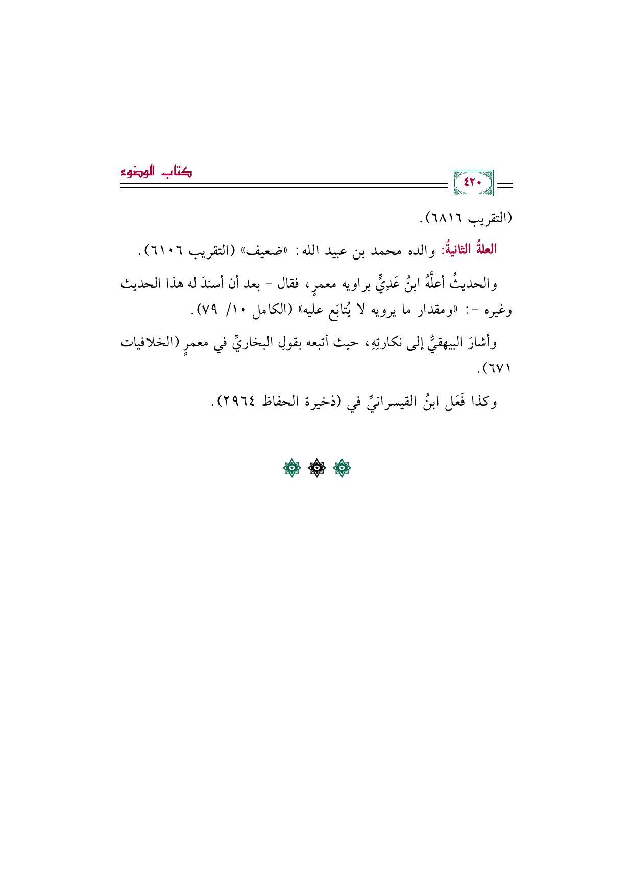 العلةُ الثانيةُ: والده محمد بن عبيد الله: "ضعيف" (التقريب ٦١٠٦).