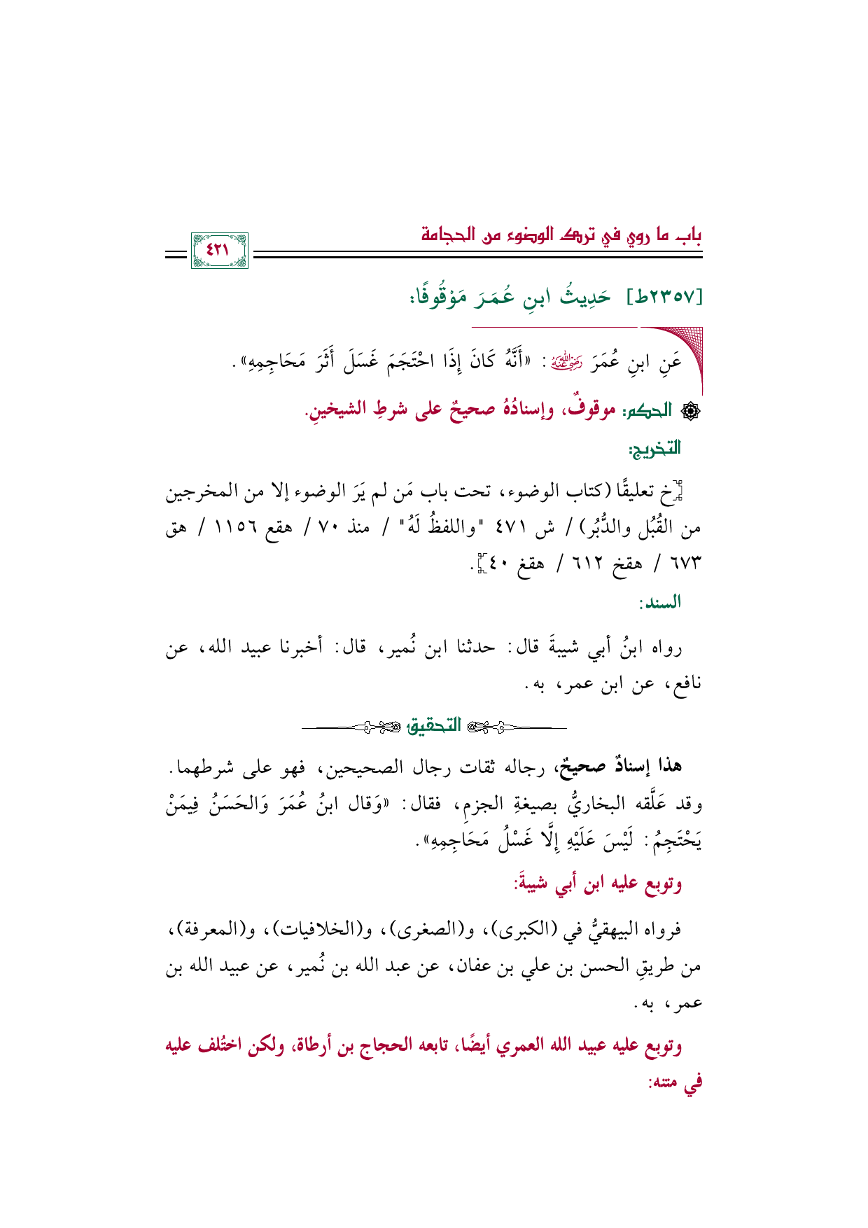 هذا إسنادٌ صحيحٌ، رجاله ثقات رجال الصحيحين، فهو على شرطهما. وقد عَلَّقه البخاريُّ بصيغةِ الجزمِ، فقال: "وَقال ابنُ عُمَرَ وَالحَسَنُ فِيمَنْ يَحْتَجِمُ: لَيْسَ عَلَيْهِ إِلَّا غَسْلُ مَحَاجِمِهِ".