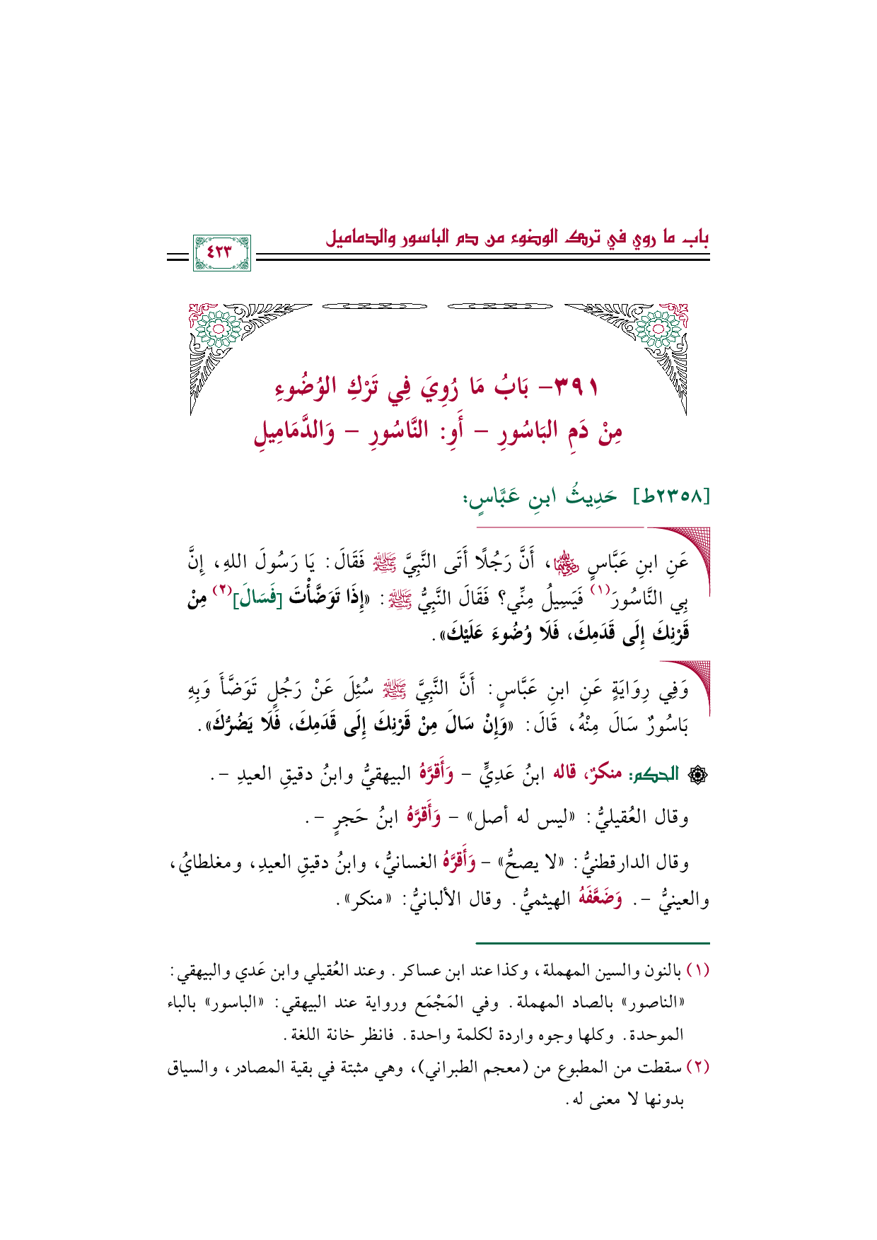 ٣٩١ - بَابُ مَا رُوِيَ فِي تَرْكِ الوُضُوءِ مِنْ دَمِ البَاسُورِ -أَوِ: النَّاسُورِ- وَالدَّمَامِيلِ