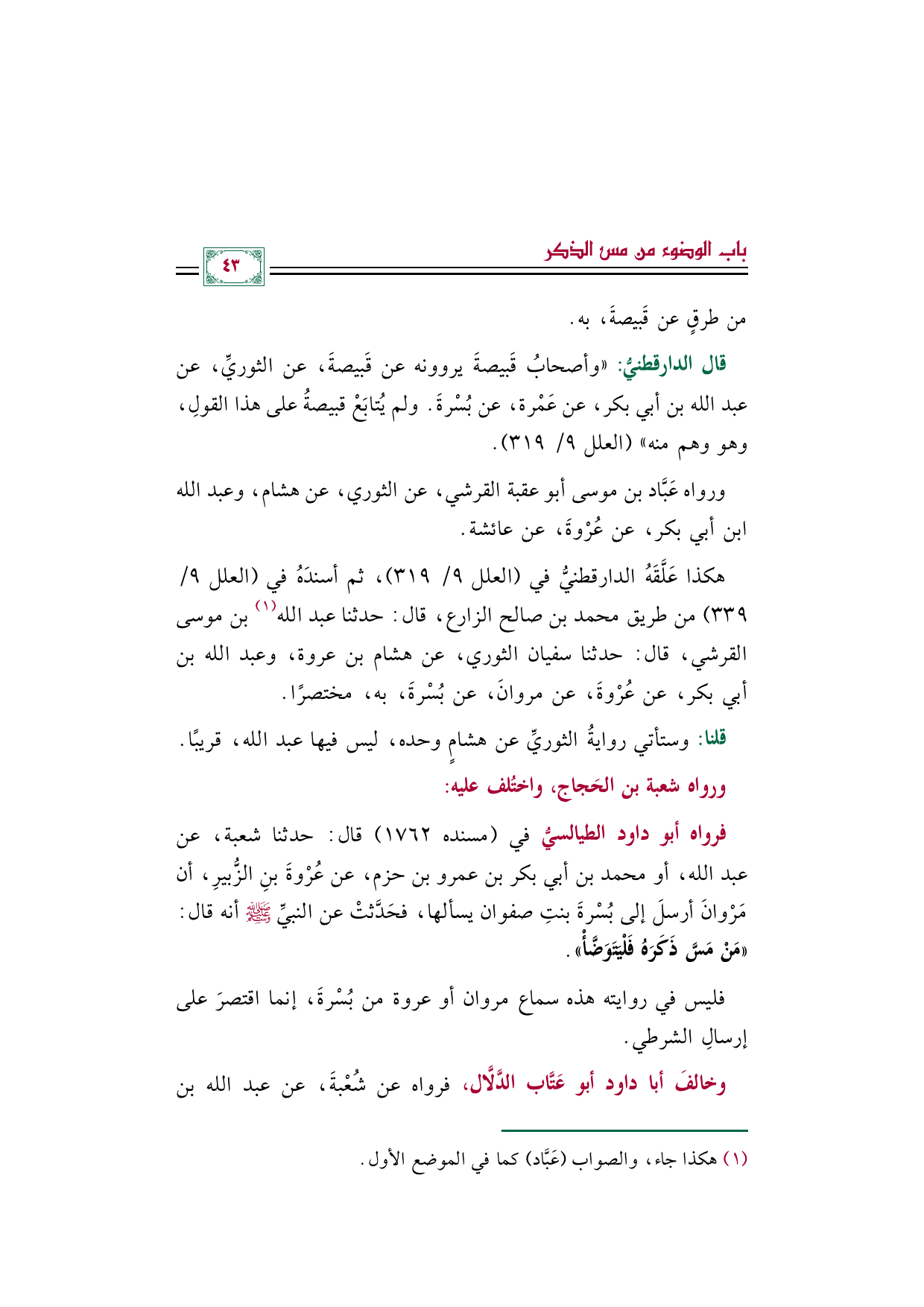 هكذا عَلَّقَهُ الدارقطنيُّ في (العلل ٩/ ٣١٩)، ثم أسندَهُ في (العلل ٩/ ٣٣٩) من طريق محمد بن صالح الزارع، قال: حدثنا عبد الله (¬١) بن موسى القرشي، قال: حدثنا سفيان الثوري، عن هشام بن عروة، وعبد الله بن أبي بكر، عن عُرْوةَ، عن مروانَ، عن بُسْرةَ، به، مختصرًا.