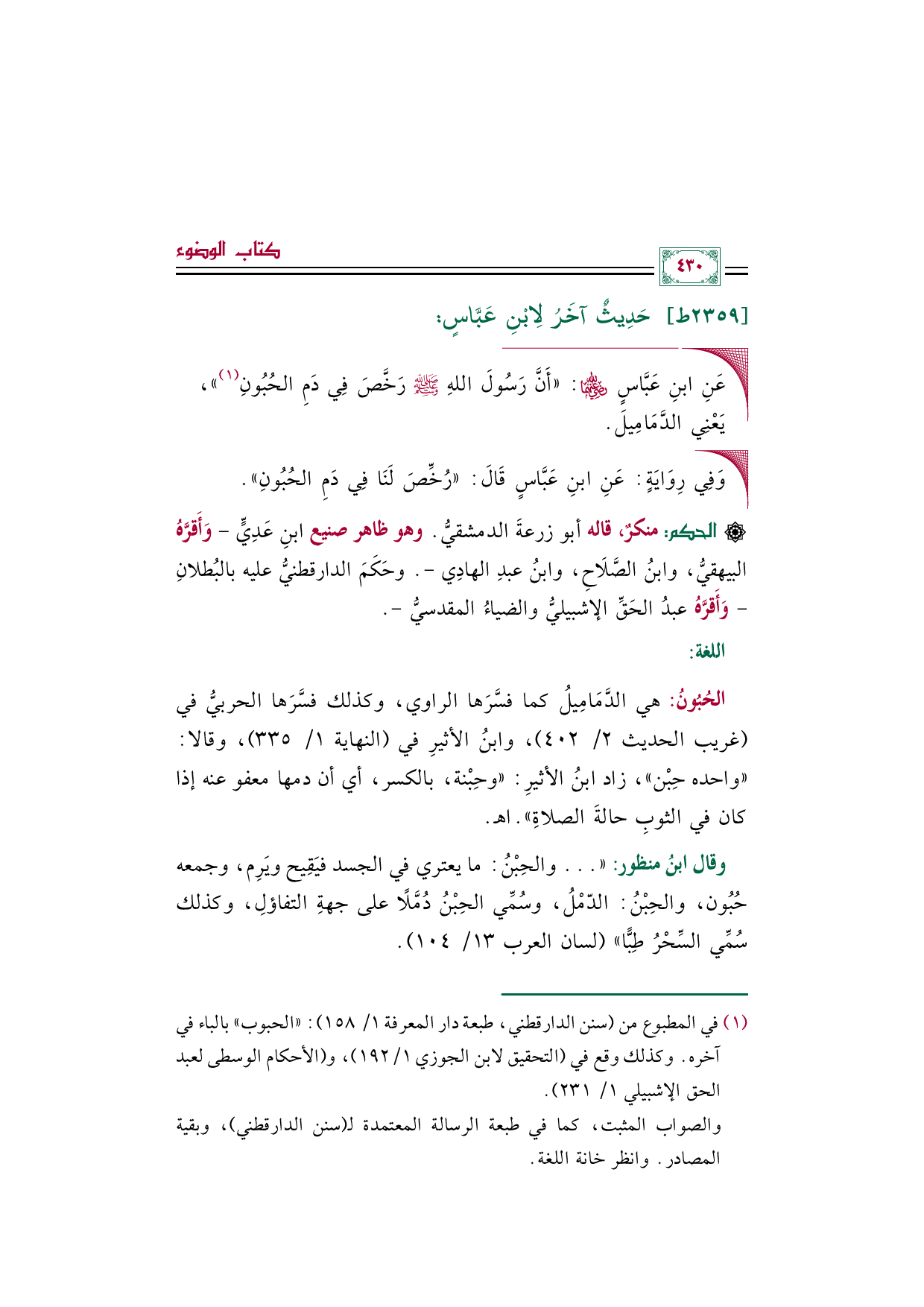 (¬١) في المطبوع من (سنن الدارقطني، طبعة دار المعرفة ١/ ١٥٨): "الحبوب" بالباء في آخره. وكذلك وقع في (التحقيق لابن الجوزي ١/ ١٩٢)، و (الأحكام الوسطى لعبد الحق الإشبيلي ١/ ٢٣١).