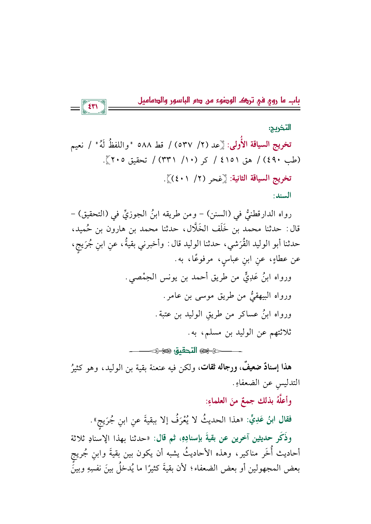 رواه الدارقطنيُّ في (السنن) -ومن طريقه ابنُ الجوزيِّ في (التحقيق) - قال: حدثنا محمد بن خَلَف الخَلَّال، حدثنا محمد بن هارون بن حُميد، حدثنا أبو الوليد القُرَشي، حدثنا الوليد قال: وأخبرني بقيةُ، عنِ ابنِ جُرَيجٍ، عن عطاءٍ، عنِ ابنِ عباسٍ، مرفوعًا، به.