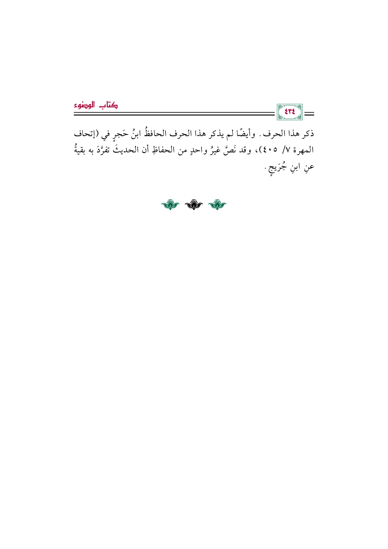 ذكر هذا الحرف. وأيضًا لم يذكر هذا الحرف الحافظُ ابنُ حَجرٍ في (إتحاف المهرة ٧/ ٤٠٥)، وقد نَصَّ غيرُ واحدٍ من الحفاظِ أن الحديثَ تفرَّدَ به بقيةُ عنِ ابنِ جُرَيجٍ.
