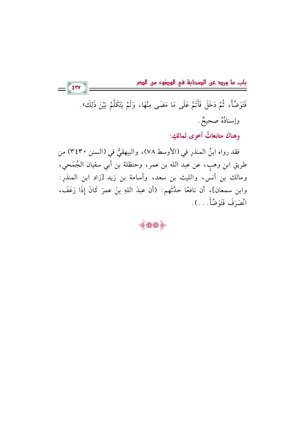 فقد رواه ابنُ المنذرِ في (الأوسط ٧٨)، والبيهقيُّ في (السنن ٣٤٣٠) من طريقِ ابنِ وهبٍ، عن عبد الله بن عمر، وحنظلة بن أبي سفيان الجُمَحي، ومالك بن أنس، والليث بن سعد، وأسامة بن زيد [زاد ابن المنذرِ: وابن سمعان]، أن نافعًا حدَّثَهم: (أن عبدَ اللهِ بنَ عمرَ كَانَ إِذَا رَعَفَ، انْصَرَفَ فَتَوَضَّأَ ... ).