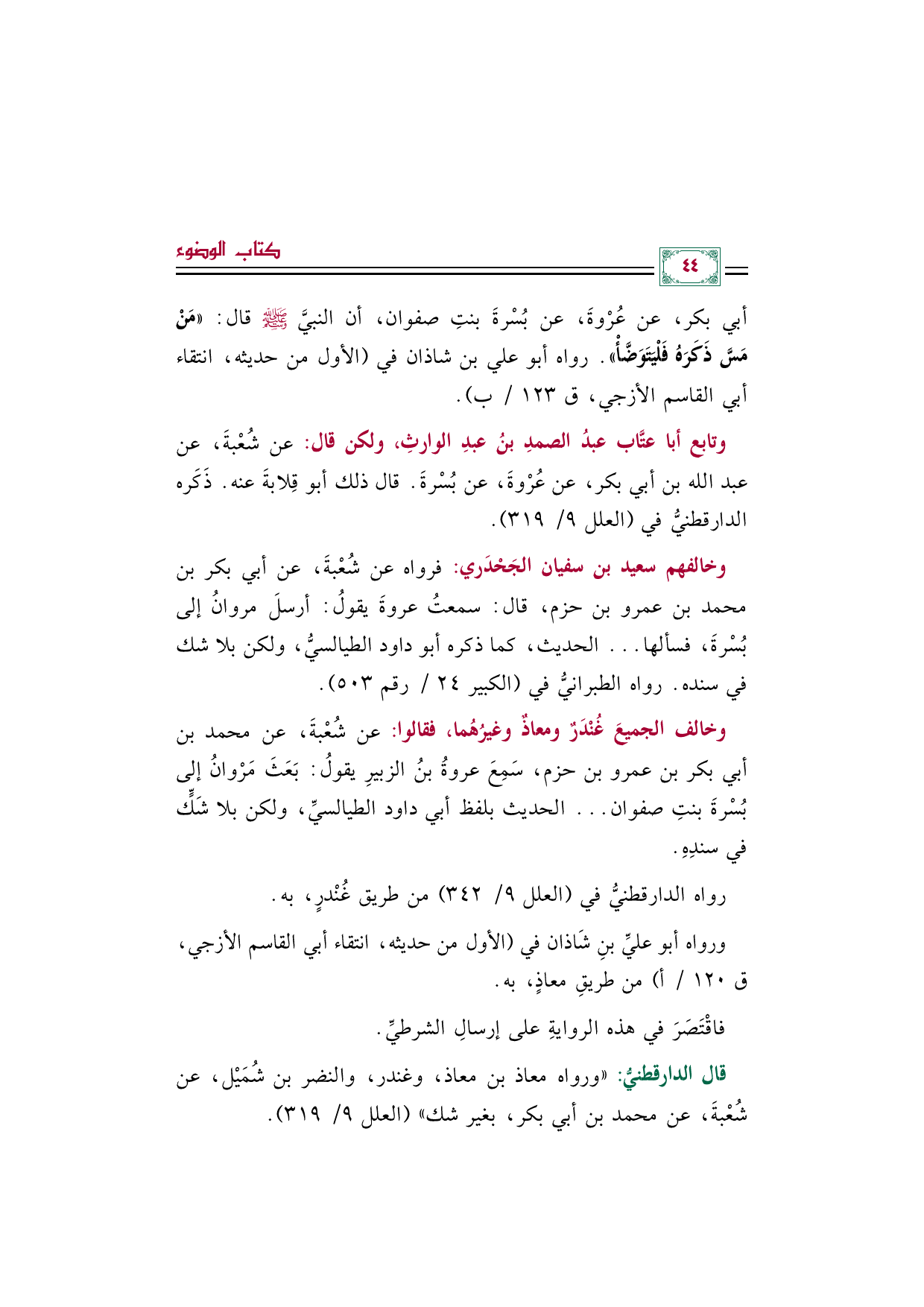 وخالف الجميعَ غُنْدَرٌ ومعاذٌ وغيرُهُما، فقالوا: عن شُعْبةَ، عن محمد بن أبي بكر بن عمرو بن حزم، سَمِعَ عروةُ بنُ الزبيرِ يقولُ: بَعَثَ مَرْوانُ إلى بُسْرةَ بنتِ صفوان ... الحديث بلفظ أبي داود الطيالسيِّ، ولكن بلا شَكٍّ في سندِهِ.