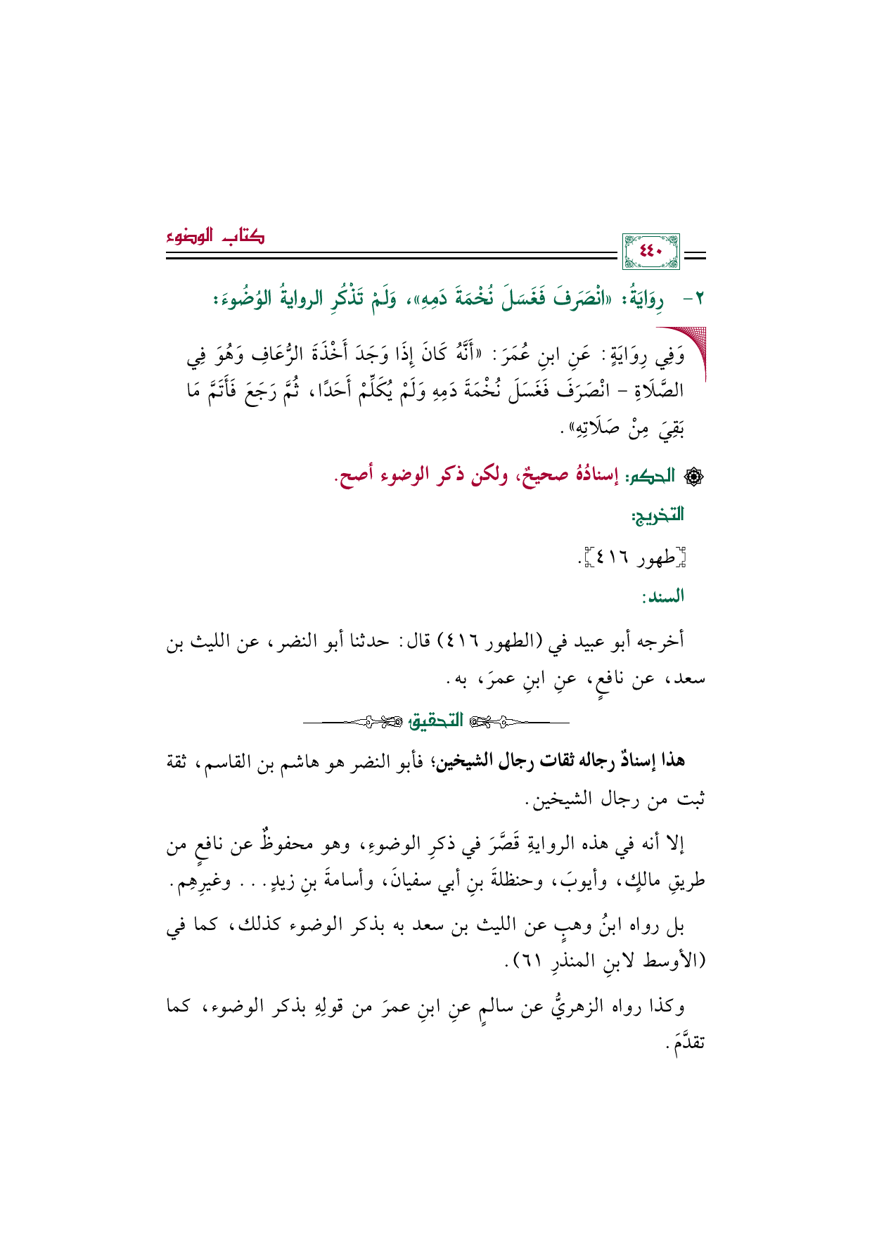 أخرجه أبو عبيد في (الطهور ٤١٦) قال: حدثنا أبو النضر، عن الليث بن سعد، عن نافعٍ، عنِ ابنِ عمرَ، به.