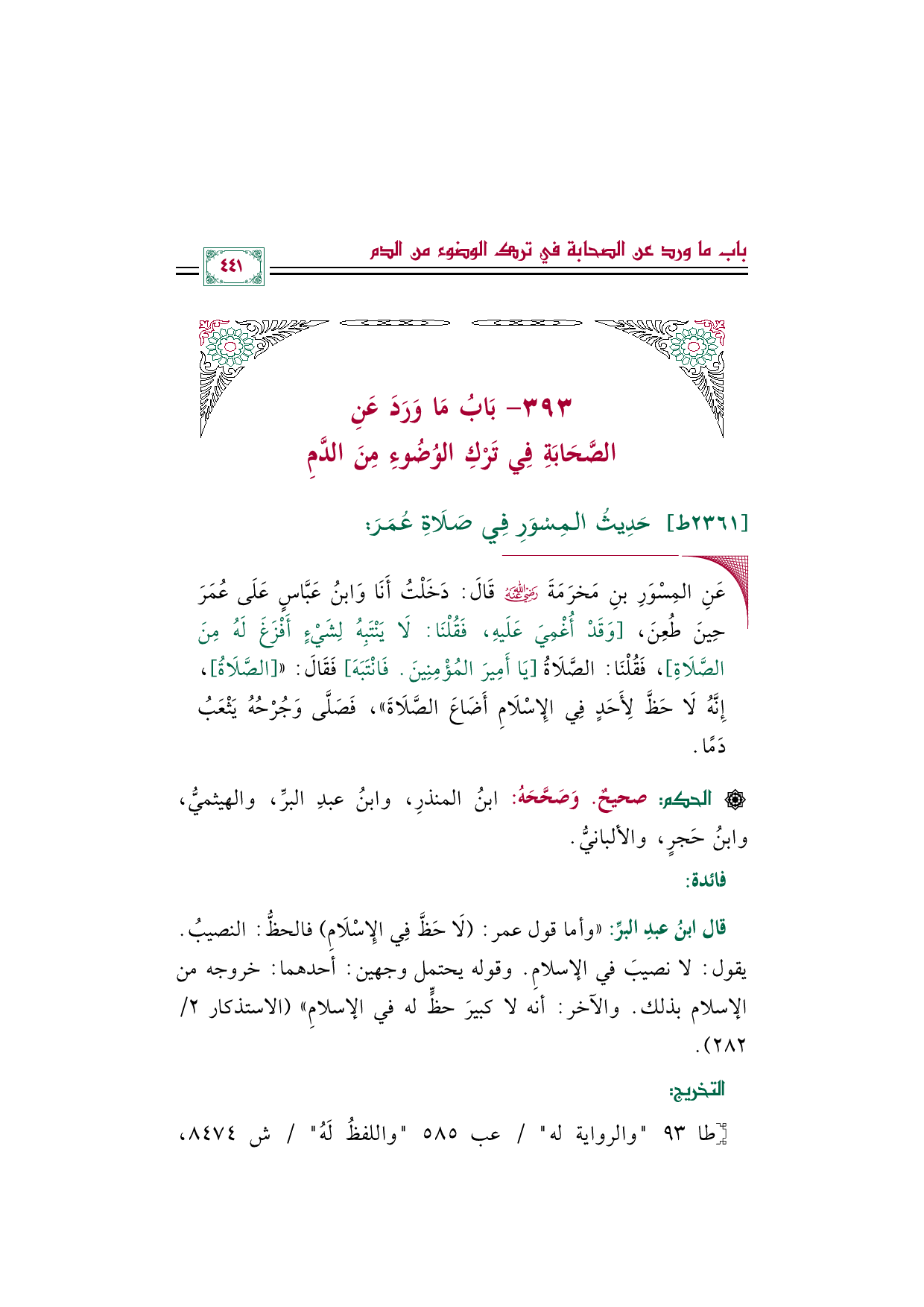 ٣٩٣ - بَابُ مَا وَرَدَ عَنِ الصَّحَابَةِ فِي تَرْكِ الوُضُوءِ مِنَ الدَّمِ