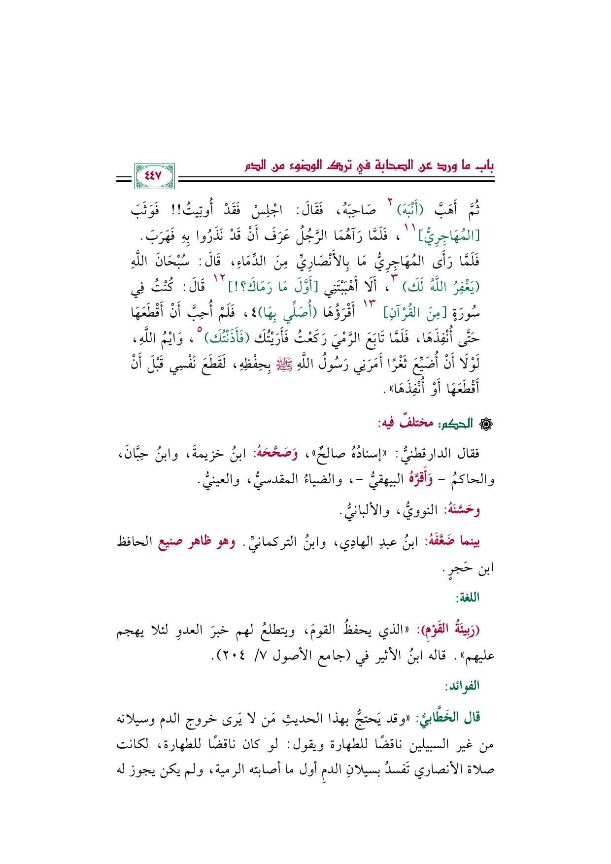 فَلَمَّا رَأَى المُهَاجِرِيُّ مَا بِالأَنْصَارِيِّ مِنَ الدِّمَاءِ، قَالَ: سُبْحَانَ اللَّهِ (يَغْفِرُ اللَّهُ لَكَ) ٣، أَلَا أَهْبَبْتَنِي [أَوَّلَ مَا رَمَاكَ؟ ! ] ١٢ قَالَ: كُنْتُ فِي سُورَةٍ [مِنَ القُرْآنِ] ١٣ أَقْرَؤُهَا (أُصَلِّي بِهَا) ٤، فَلَمْ أُحِبَّ أَنْ أَقْطَعَهَا حَتَّى أُنْفِذَهَا، فَلَمَّا تَابَعَ الرَّمْيَ رَكَعْتُ فَأَرَيْتُكَ (فَأَذَنْتُكَ) ٥، وَايْمُ اللَّهِ، لَوْلَا أَنْ أُضَيِّعَ ثَغْرًا أَمَرَنِي رَسُولُ اللَّهِ صلى الله عليه وسلم بِحِفْظِهِ، لَقَطَعَ نَفْسِي قَبْلَ أَنْ أَقْطَعَهَا أَوْ أُنْفِذَهَا)).