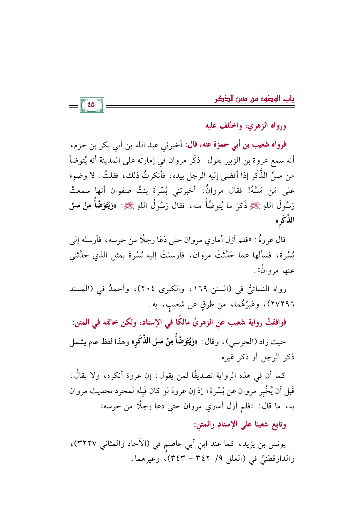 فرواه شعيب بن أبي حمزة عنه، قال: أخبرني عبد الله بن أبي بكر بن حزم، أنه سمع عروة بن الزبير يقول: ذَكَر مروان في إمارته على المدينة أنه يُتوضأ من مسِّ الذَّكَر إذا أفضى إليه الرجل بيده، فأنكرتُ ذلك، فقلتُ: لا وضوءَ على مَن مَسَّهُ! فقال مروانُ: أخبرتني بُسْرةَ بنتُ صفوان أنها سمعتْ رَسُولَ اللهِ صلى الله عليه وسلم ذَكرَ ما يُتوضَّأُ منه، فقال رَسُولُ اللهِ صلى الله عليه وسلم: ((وَيُتَوَضَّأُ مِنْ مَسِّ الذَّكَرِ)).