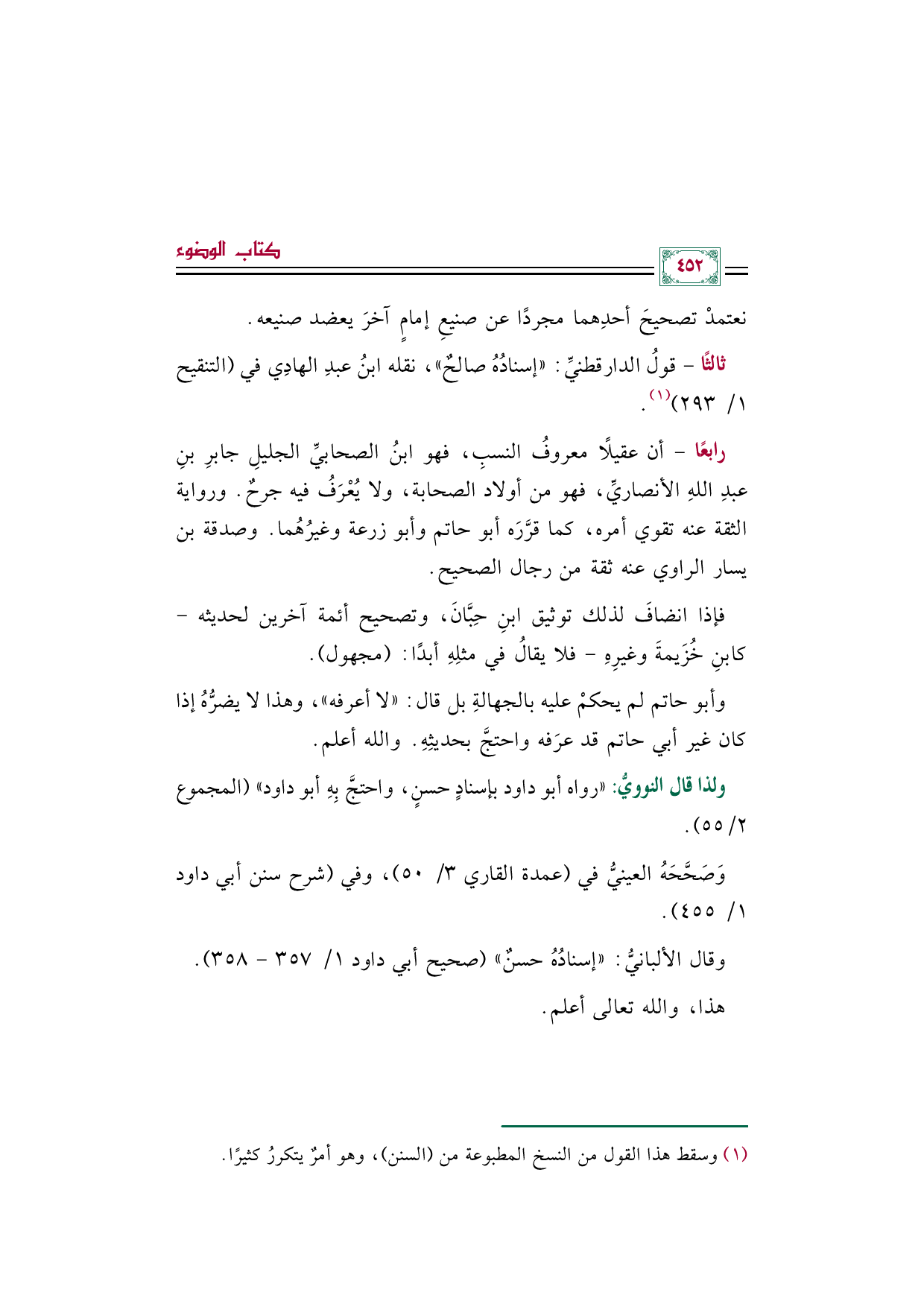 ثالثًا- قولُ الدارقطنيِّ: "إسنادُهُ صالحٌ"، نقله ابنُ عبدِ الهادِي في (التنقيح ١/ ٢٩٣) (¬١).