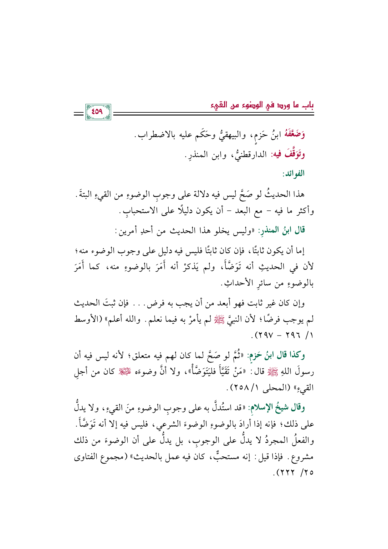 * وقال شيخُ الإسلامِ: "قد استُدلَّ به على وجوبِ الوضوءِ منَ القيءِ، ولا يدلُّ على ذلك؛ فإنه إذا أرادَ بالوضوءِ الوضوءَ الشرعي، فليس فيه إلا أنه تَوَضَّأَ. والفعلُ المجردُ لا يدلُّ على الوجوبِ، بل يدلُّ على أن الوضوءَ من ذلك مشروع. فإذا قيل: إنه مستحبٌّ، كان فيه عمل بالحديث" (مجموع الفتاوى ٢٥/ ٢٢٢).