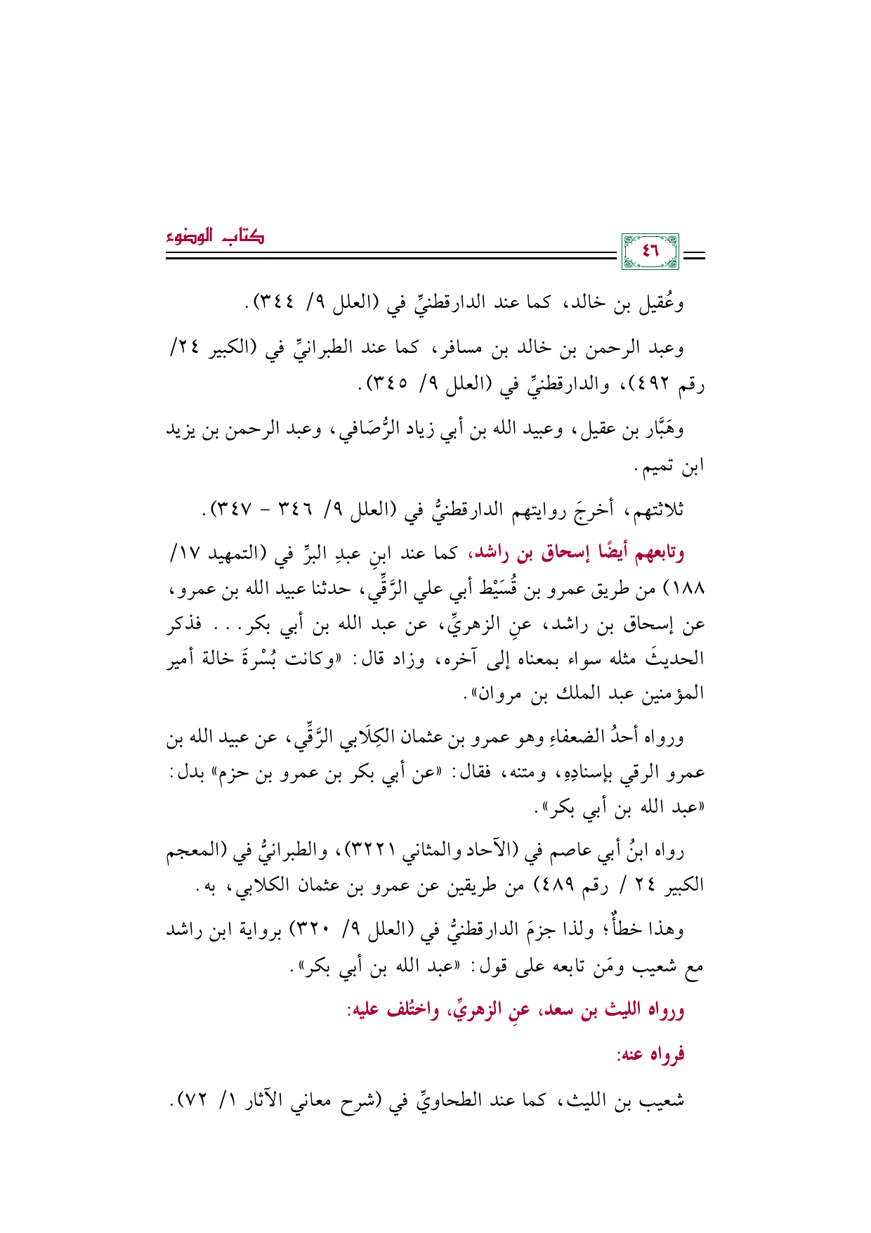 وتابعهم أيضًا إسحاق بن راشد، كما عند ابنِ عبدِ البرِّ في (التمهيد ١٧/ ١٨٨) من طريق عمرو بن قُسَيْط أبي علي الرَّقِّي، حدثنا عبيد الله بن عمرو، عن إسحاق بن راشد، عنِ الزهريِّ، عن عبد الله بن أبي بكر ... فذكر الحديثَ مثله سواء بمعناه إلى آخره، وزاد قال: ((وكانت بُسْرةَ خالة أمير المؤمنين عبد الملك بن مروان)).
