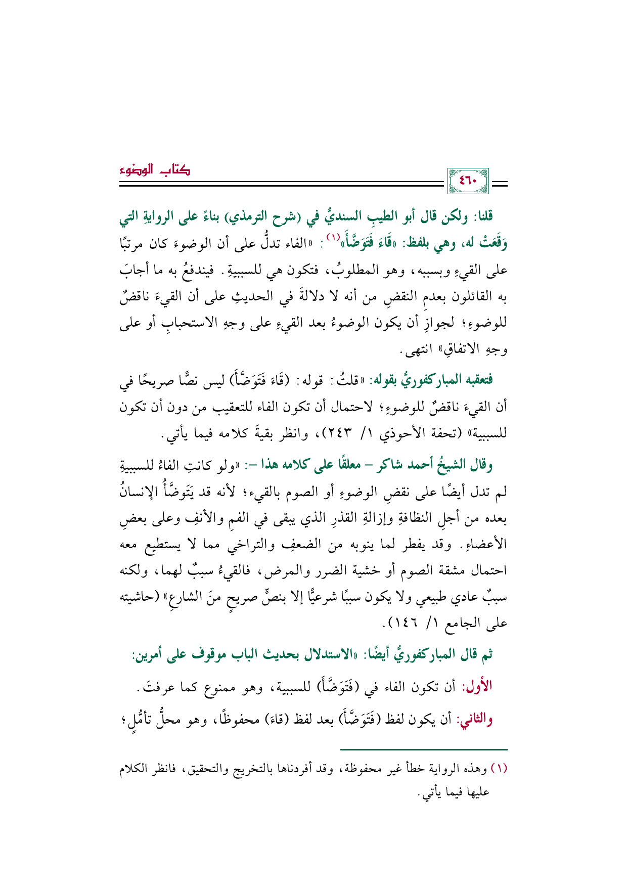 * وقال الشيخُ أحمد شاكر -معلقًا على كلامه هذا-: "ولو كانتِ الفاءُ للسببيةِ لم تدل أيضًا على نقضِ الوضوءِ أو الصوم بالقيء؛ لأنه قد يَتَوضَّأُ الإنسانُ بعده من أجلِ النظافةِ وإزالةِ القذرِ الذي يبقى في الفمِ والأنفِ وعلى بعضِ الأعضاءِ. وقد يفطر لما ينوبه من الضعفِ والتراخي مما لا يستطيع معه احتمال مشقة الصوم أو خشية الضرر والمرض، فالقيءُ سببٌ لهما، ولكنه سببٌ عادي طبيعي ولا يكون سببًا شرعيًّا إلا بنصٍّ صريحٍ منَ الشارعِ" (حاشيته على الجامع ١/ ١٤٦).
