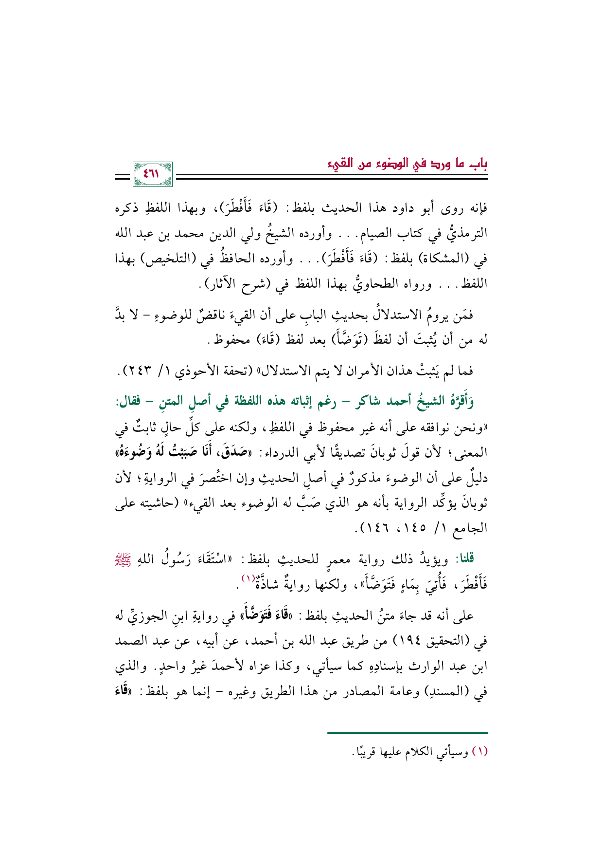 فمَن يرومُ الاستدلالُ بحديثِ البابِ على أن القيءَ ناقضٌ للوضوءِ- لا بدَّ له من أن يُثبتَ أن لفظَ (تَوَضَّأَ) بعد لفظ (قَاءَ) محفوظ.