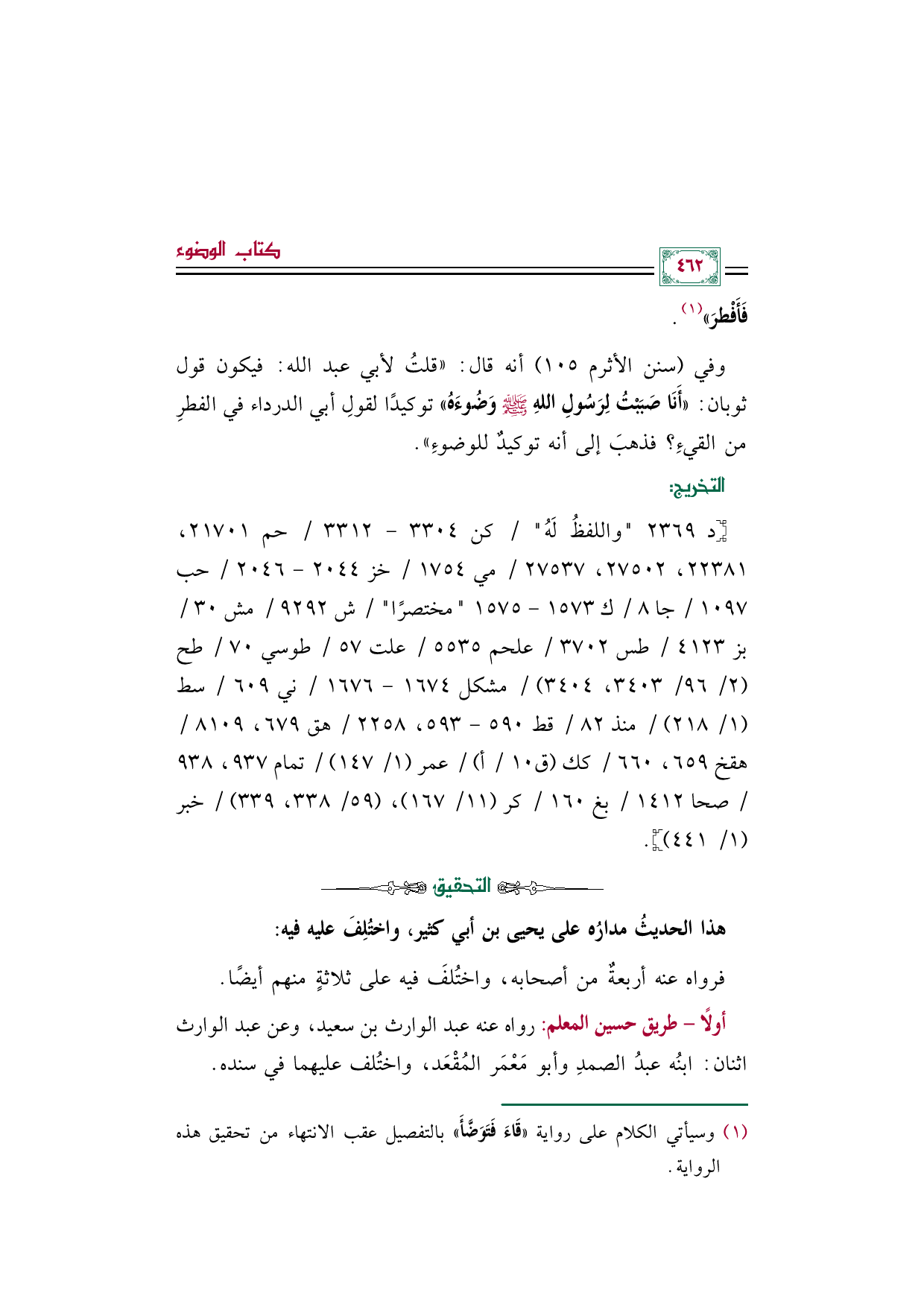وفي (سنن الأثرم ١٠٥) أنه قال: "قلتُ لأبي عبد الله: فيكون قول ثوبان: ((أَنَا صَبَبْتُ لِرَسُولِ اللهِ صلى الله عليه وسلم وَضُوءَهُ)) توكيدًا لقولِ أبي الدرداء في الفطرِ من القيءِ؟ فذهبَ إلى أنه توكيدٌ للوضوءِ".