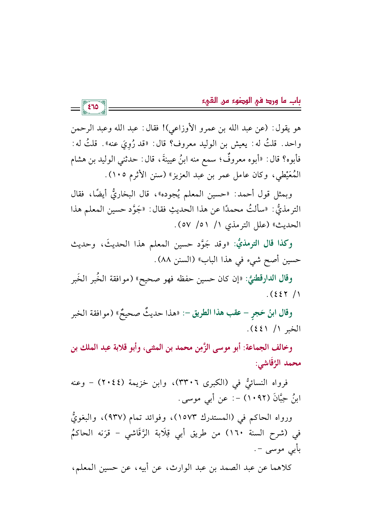 وبمثل قول أحمد: "حسين المعلم يُجوده"، قال البخاريُّ أيضًا، فقال الترمذيُّ: "سألتُ محمدًا عن هذا الحديثِ فقال: "جَوَّد حسين المعلم هذا الحديث" (علل الترمذي ١/ ٥١/ ٥٧).