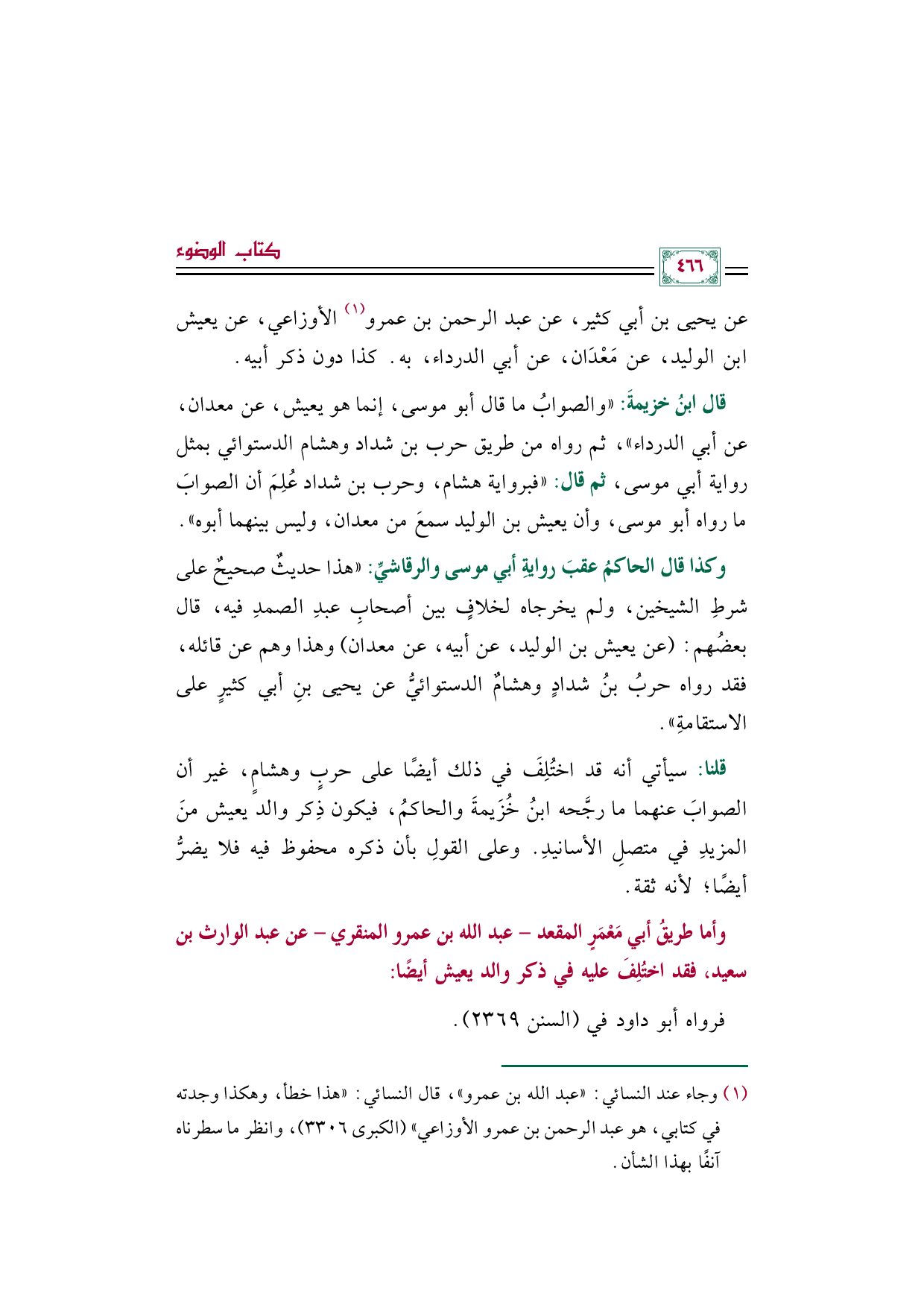 قال ابنُ خزيمةَ: "والصوابُ ما قال أبو موسى، إنما هو يعيش، عن معدان، عن أبي الدرداء"، ثم رواه من طريق حرب بن شداد وهشام الدستوائي بمثل رواية أبي موسى، ثم قال: "فبرواية هشام، وحرب بن شداد عُلِمَ أن الصوابَ ما رواه أبو موسى، وأن يعيش بن الوليد سمعَ من معدان، وليس بينهما أبوه".