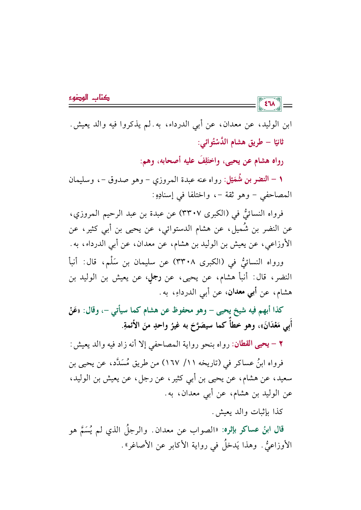ورواه النسائيُّ في (الكبرى ٣٣٠٨) عن سليمان بن سَلْم، قال: أنبأ النضر، قال: أنبأ هشام، عن يحيى، عن رجلٍ، عن يعيش بن الوليد بن هشام، عن أبي معدان، عن أبي الدرداءِ، به.