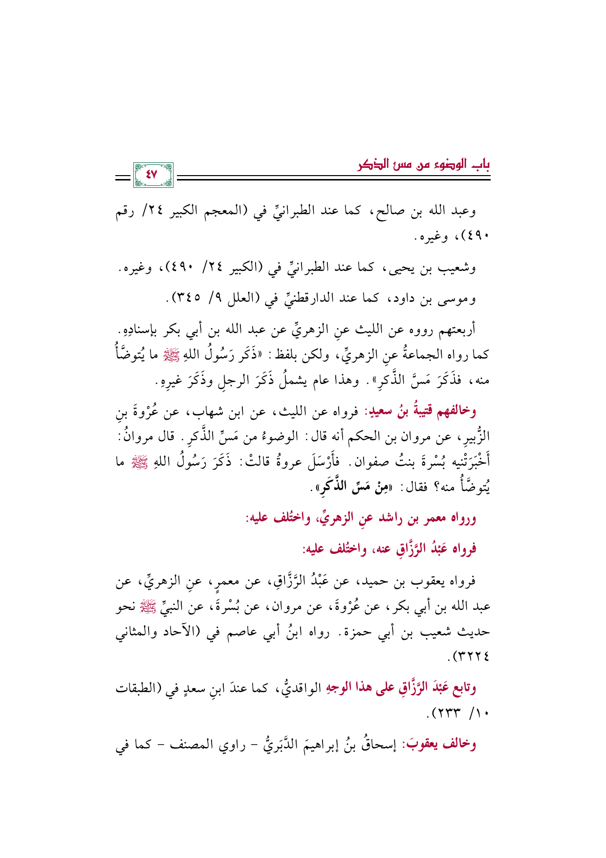فرواه يعقوب بن حميد، عن عَبْدُ الرَّزَّاقِ، عن معمرٍ، عنِ الزهريِّ، عن عبد الله بن أبي بكر، عن عُرْوةَ، عن مروان، عن بُسْرةَ، عن النبيِّ صلى الله عليه وسلم نحو حديث شعيب بن أبي حمزة. رواه ابنُ أبي عاصم في (الآحاد والمثاني ٣٢٢٤).
