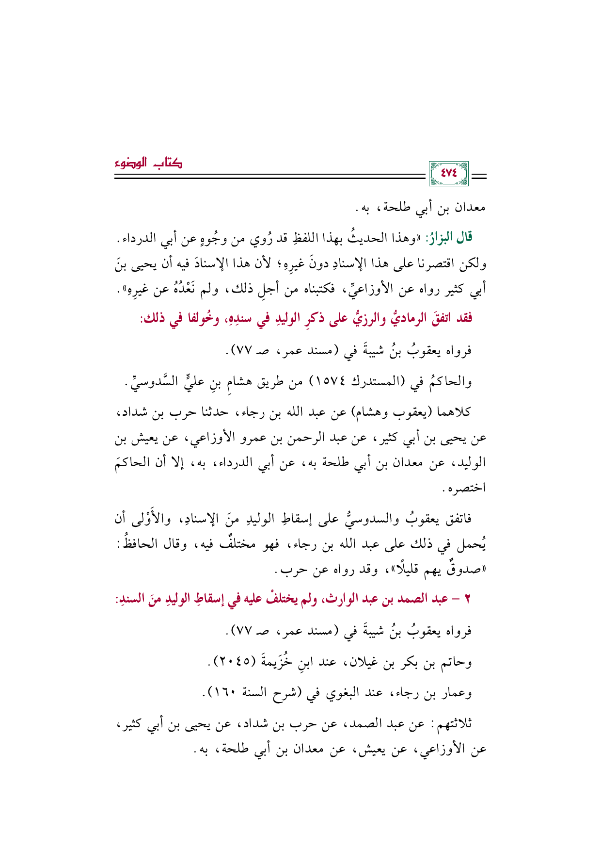 فاتفق يعقوبُ والسدوسيُّ على إسقاطِ الوليدِ منَ الإسنادِ، والأَوْلى أن يُحمل في ذلك على عبد الله بن رجاء، فهو مختلفٌ فيه، وقال الحافظُ: "صدوقٌ يهم قليلًا"، وقد رواه عن حرب.