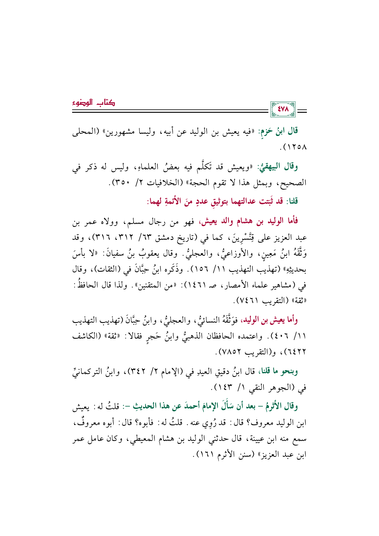 فأما الوليد بن هشام والد يعيش، فهو من رجال مسلم، وولاه عمر بن عبد العزيز على قِنَّسْرِينَ، كما في (تاريخ دمشق ٦٣/ ٣١٢، ٣١٦)، وقد وَثَّقَهُ ابنُ مَعِينٍ، والأوزاعيُّ، والعجليُّ. وقال يعقوبُ بنُ سفيانَ: "لا بأسَ بحديثِهِ" (تهذيب التهذيب ١١/ ١٥٦). وذَكَره ابنُ حِبَّانَ في (الثقات)، وقال في (مشاهير علماء الأمصار، صـ ١٤٦١): "من المتقنين". ولذا قال الحافظُ: "ثقة" (التقريب ٧٤٦١).