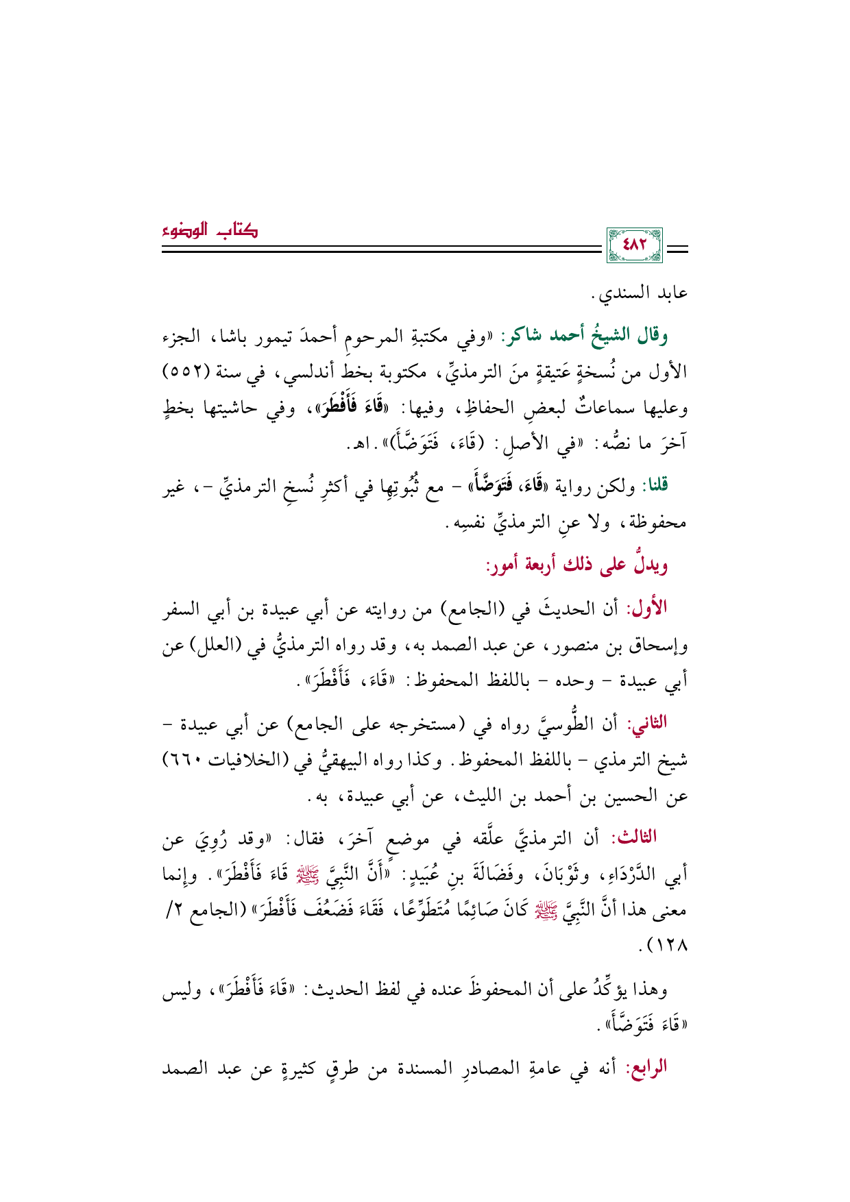 وقال الشيخُ أحمد شاكر: "وفي مكتبةِ المرحومِ أحمدَ تيمور باشا، الجزء الأول من نُسخةٍ عَتيقةٍ منَ الترمذيِّ، مكتوبة بخط أندلسي، في سنة (٥٥٢) وعليها سماعاتٌ لبعضِ الحفاظِ، وفيها: ((قَاءَ فَأَفْطَرَ))، وفي حاشيتها بخطٍ آخرَ ما نصُّه: "في الأصلِ: (قَاءَ، فَتَوَضَّأَ) "اهـ.