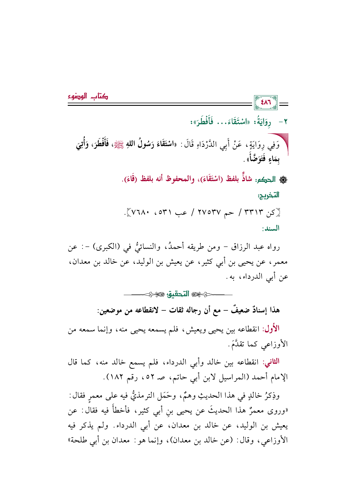 • وَفِي رِوَايَةٍ، عَنْ أَبِي الدَّرْدَاءِ قَالَ: ((اسْتَقَاءَ رَسُولُ اللهِ صلى الله عليه وسلم، فَأَفْطَرَ، وَأُتِيَ بِمَاءٍ فَتَوَضَّأَ)).