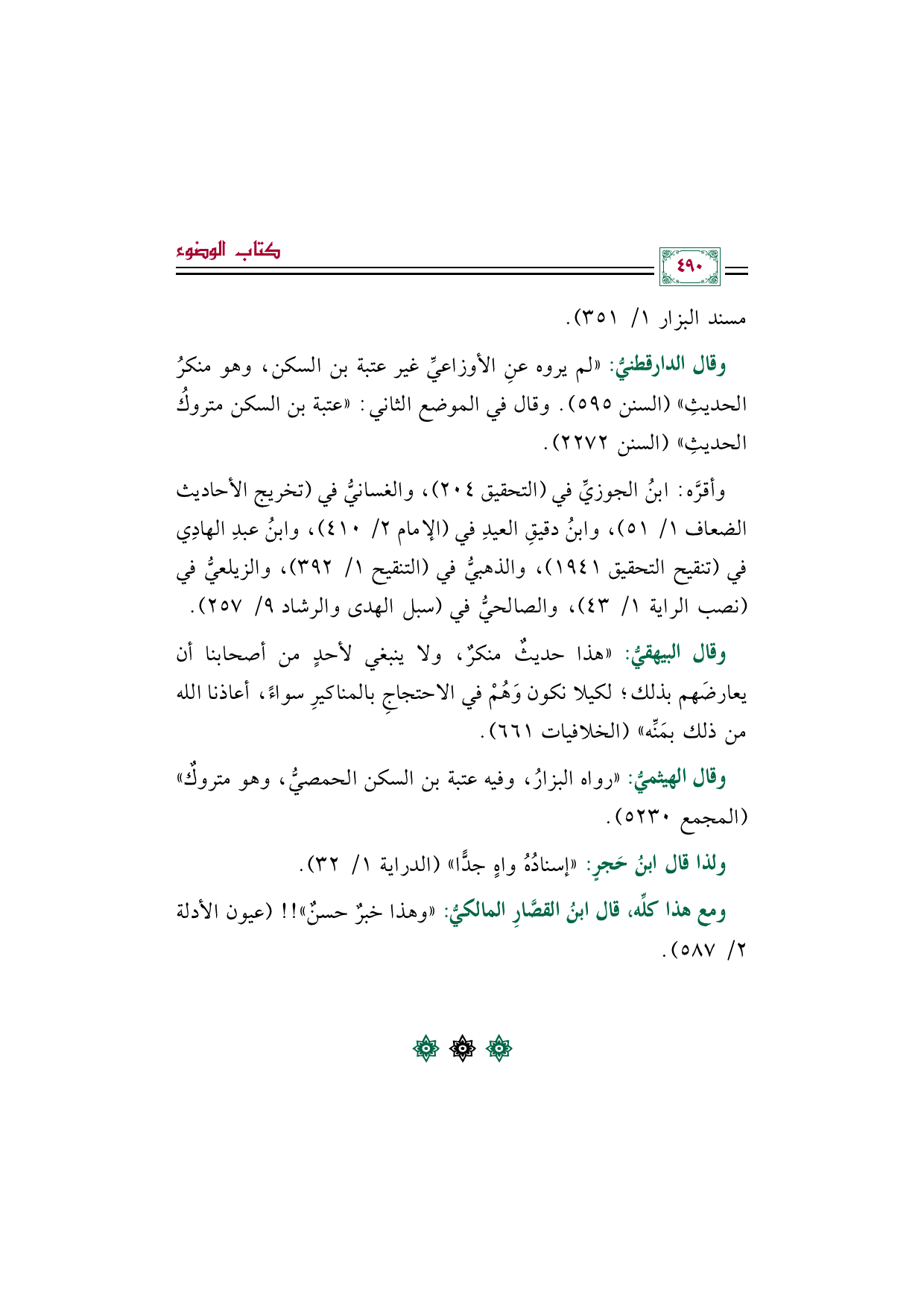وقال الدارقطنيُّ: "لم يروه عنِ الأوزاعيِّ غير عتبة بن السكن، وهو منكرُ الحديثِ" (السنن ٥٩٥). وقال في الموضع الثاني: "عتبة بن السكن متروكُ الحديثِ" (السنن ٢٢٧٢).