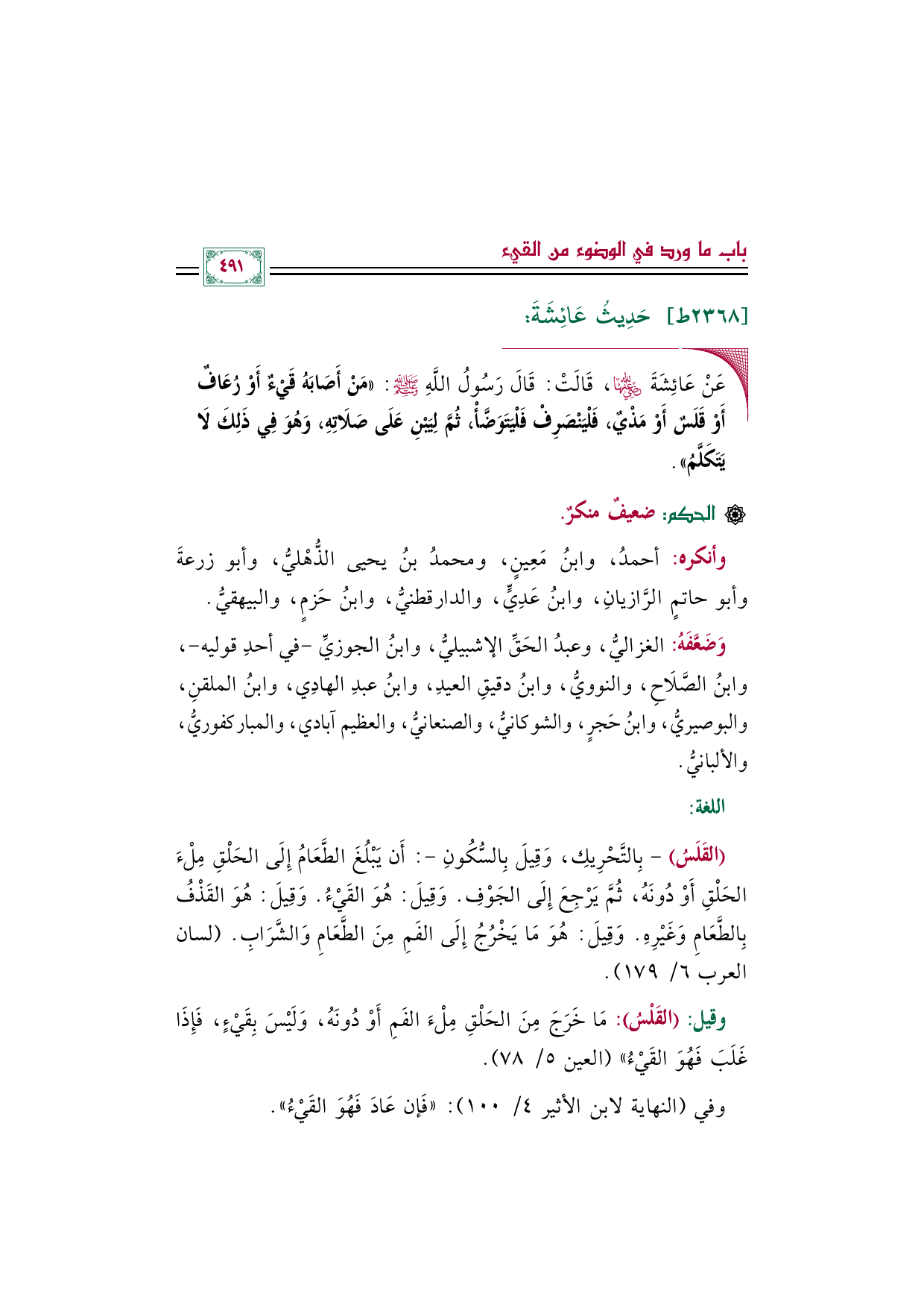 ◼ عَنْ عَائِشَةَ رضي الله عنها، قَالَتْ: قَالَ رَسُولُ اللَّهِ صلى الله عليه وسلم: ((مَنْ أَصَابَهُ قَيْءٌ أَوْ رُعَافٌ أَوْ قَلَسٌ أَوْ مَذْيٌ، فَلْيَنْصَرِفْ فَلْيَتَوَضَّأْ، ثُمَّ لِيَبْنِ عَلَى صَلَاتِهِ، وَهُوَ فِي ذَلِكَ لَا يَتَكَلَّمُ)).