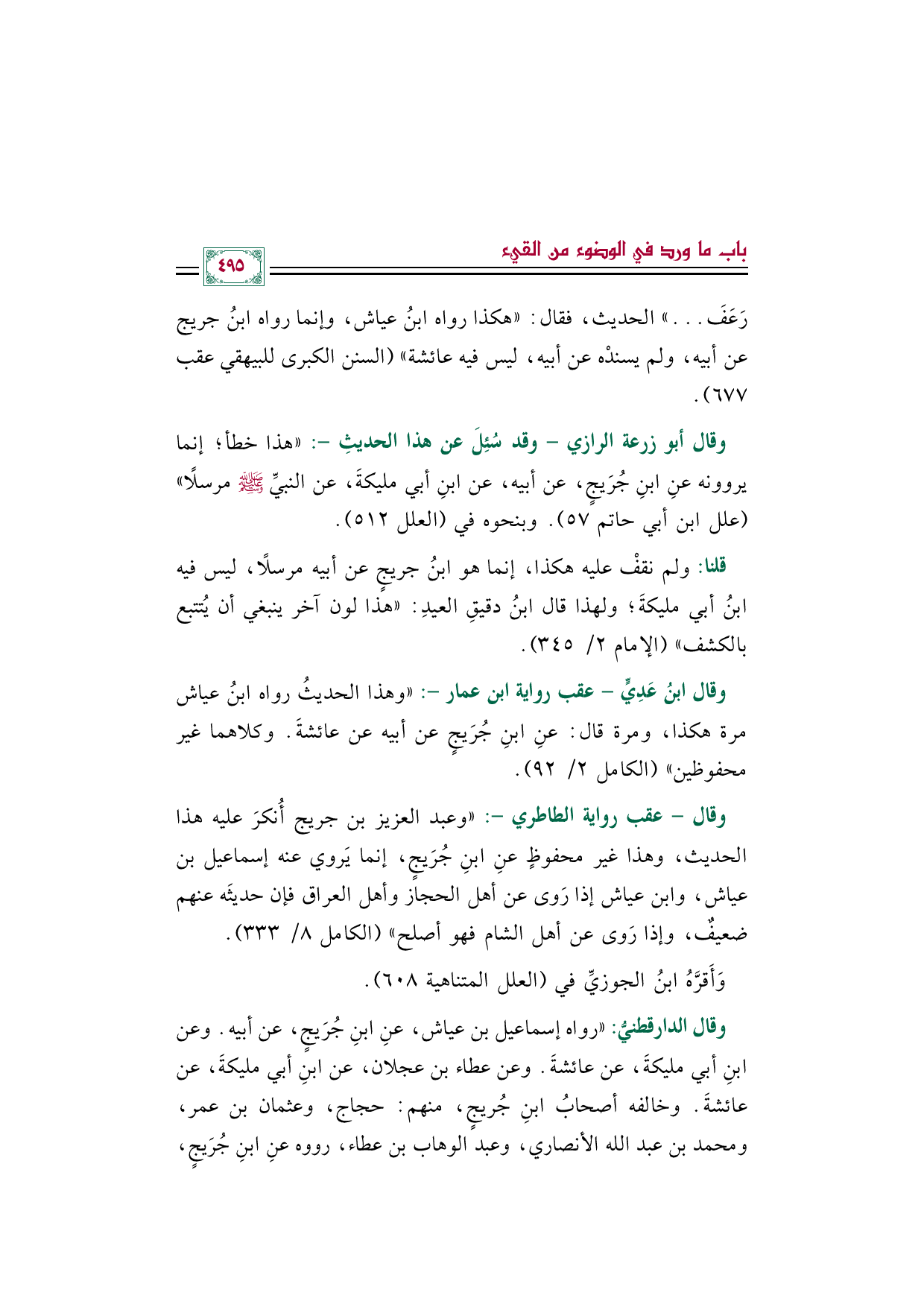 رَعَفَ ... )) الحديث، فقال: "هكذا رواه ابنُ عياش، وإنما رواه ابنُ جريج عن أبيه، ولم يسندْه عن أبيه، ليس فيه عائشة" (السنن الكبرى للبيهقي عقب ٦٧٧).
