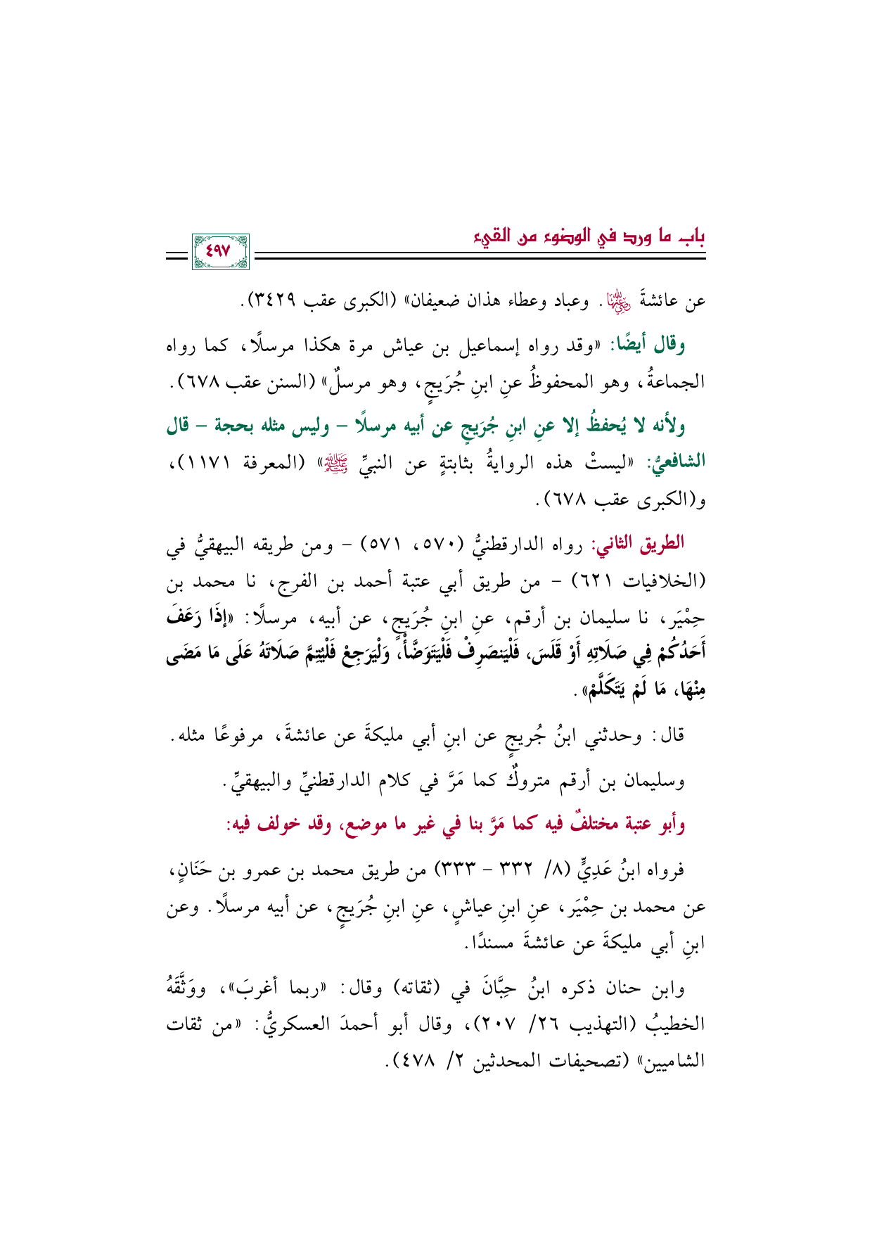 الطريق الثاني: رواه الدارقطنيُّ (٥٧٠، ٥٧١) -ومن طريقه البيهقيُّ في (الخلافيات ٦٢١) - من طريق أبي عتبة أحمد بن الفرج، نا محمد بن حِمْيَر، نا سليمان بن أرقم، عنِ ابنِ جُرَيجٍ، عن أبيه، مرسلًا: ((إذَا رَعَفَ أَحَدُكُمْ فِي صَلَاتِهِ أَوْ قَلَسَ، فَلْيَنصَرِفْ فَلْيَتَوَضَّأْ، وَلْيَرَجِعْ فَلْيُتِمَّ صَلَاتَهُ عَلَى مَا مَضَى مِنْهَا، مَا لَمْ يَتَكَلَّمْ)).