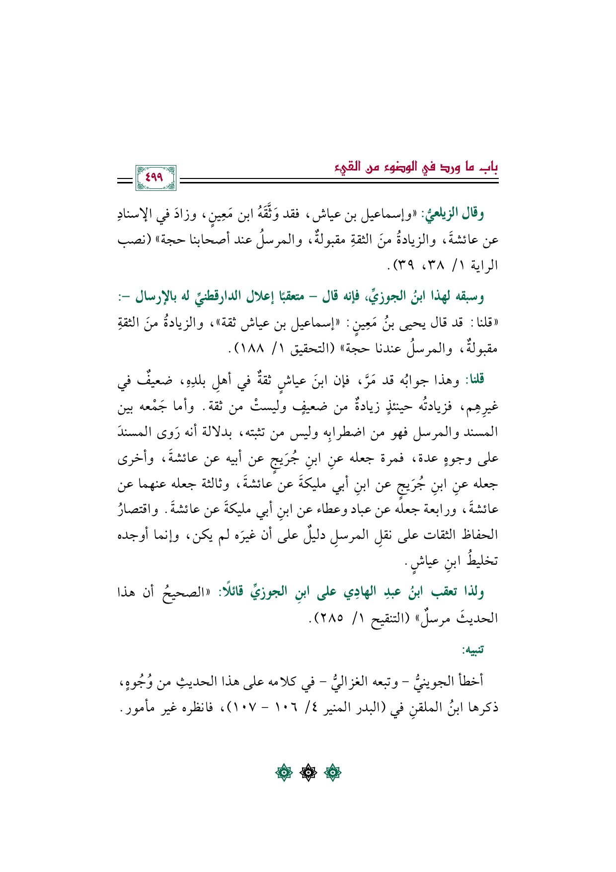 وسبقه لهذا ابنُ الجوزيِّ، فإنه قال -متعقبًا إعلال الدارقطنيِّ له بالإرسال-: "قلنا: قد قال يحيى بنُ مَعِينٍ: "إسماعيل بن عياش ثقة"، والزيادةُ منَ الثقةِ مقبولةٌ، والمرسلُ عندنا حجة" (التحقيق ١/ ١٨٨).