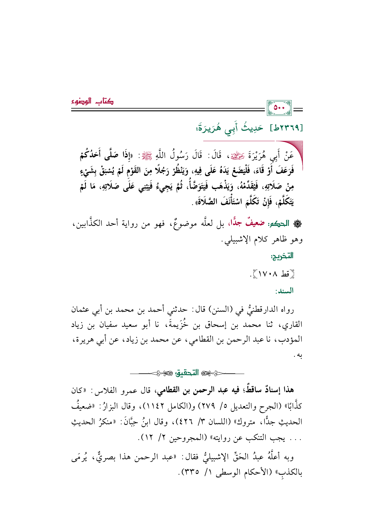 رواه الدارقطنيُّ في (السنن) قال: حدثني أحمد بن محمد بن أبي عثمان القاري، ثنا محمد بن إسحاق بن خُزَيمةَ، نا أبو سعيد سفيان بن زياد المؤدب، نا عبد الرحمن بن القطامي، عن محمد بن زياد، عن أبي هريرة، به.