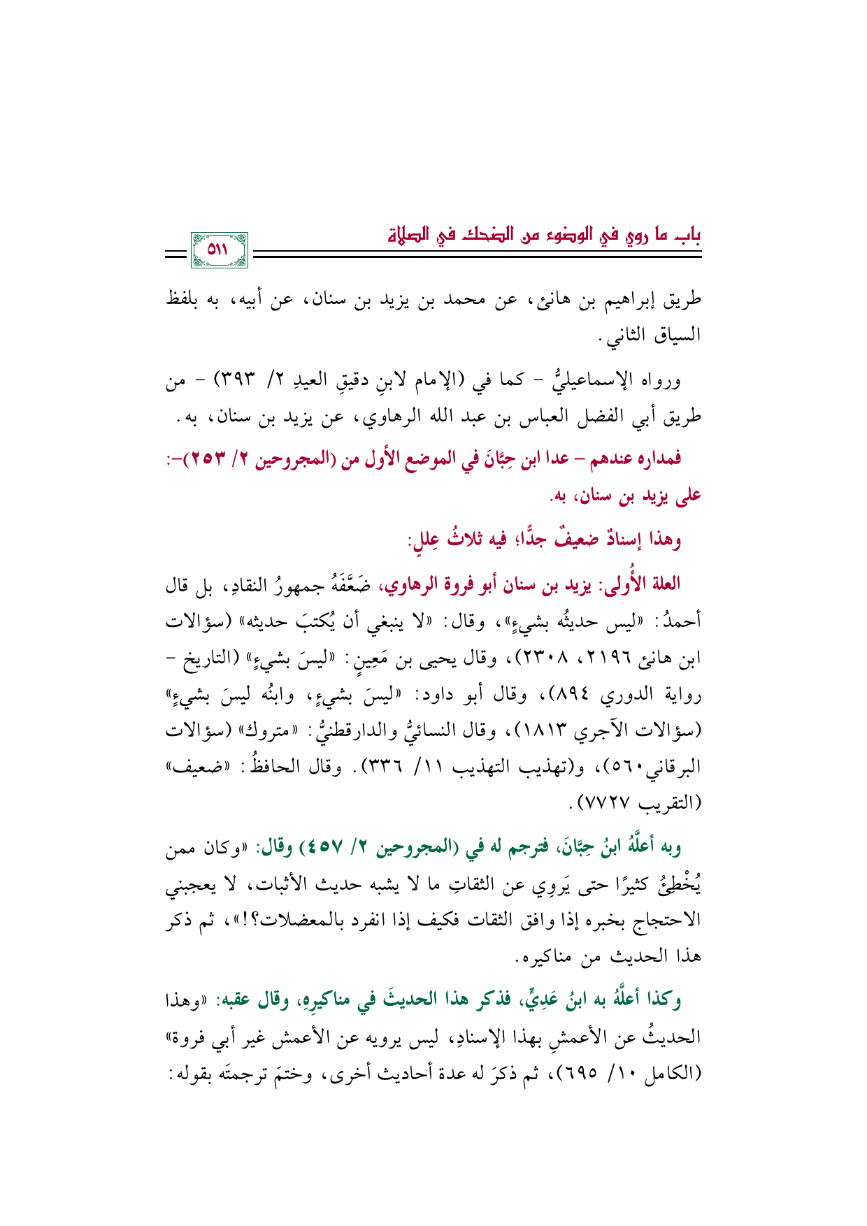 فمداره عندهم -عدا ابن حِبَّانَ في الموضع الأول من (المجروحين ٢/ ٢٥٣) -: على يزيد بن سنان، به.