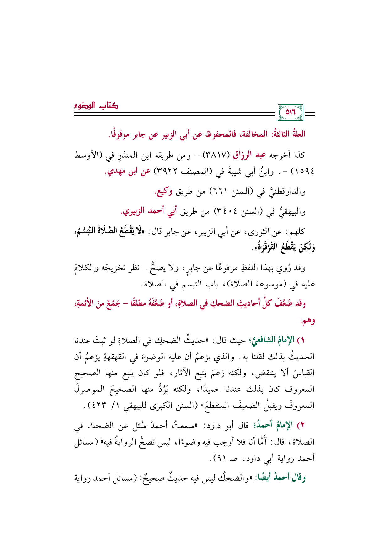 ٢) الإمامُ أحمدُ؛ قال أبو داود: "سمعتُ أحمدَ سُئل عن الضحك في الصلاة، قال: أَمَّا أنا فلا أوجب فيه وضوءًا، ليس تصحُّ الروايةُ فيه" (مسائل أحمد رواية أبي داود، صـ ٩١).