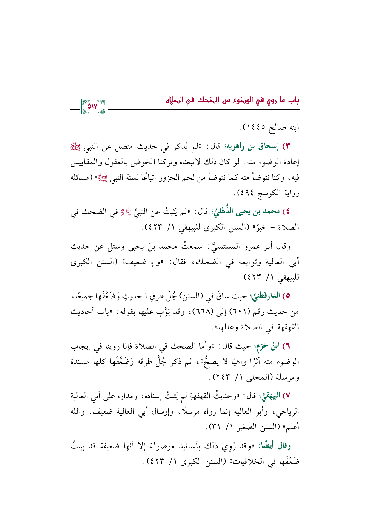 ٤) محمد بن يحيى الذُّهْليُّ؛ قال: "لم يَثبتْ عن النبيِّ صلى الله عليه وسلم في الضحك في الصلاة- خبرٌ" (السنن الكبرى للبيهقي ١/ ٤٢٣).
