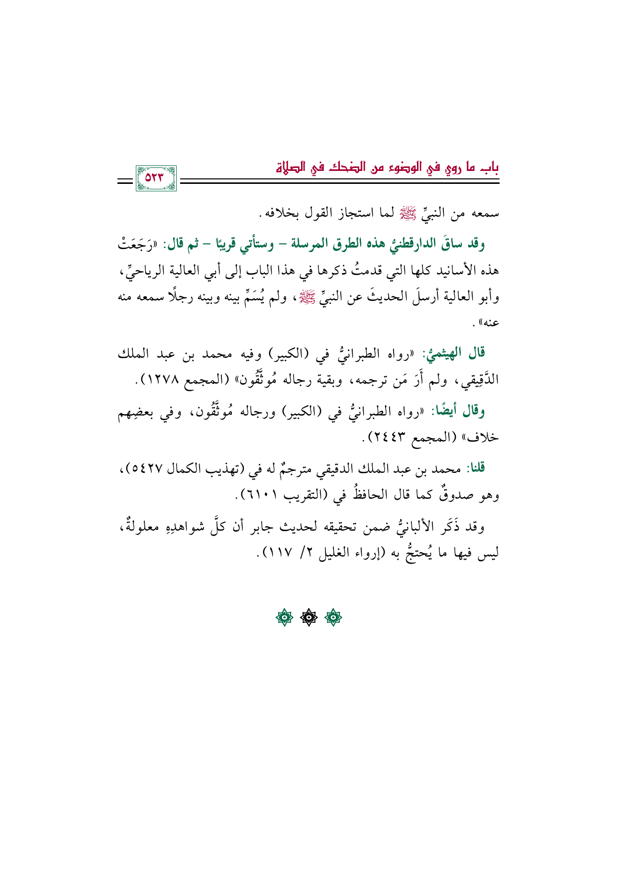 وقد ذَكَر الألبانيُّ ضمن تحقيقه لحديث جابر أن كلَّ شواهدِهِ معلولةٌ، ليس فيها ما يُحتجُّ به (إرواء الغليل ٢/ ١١٧).