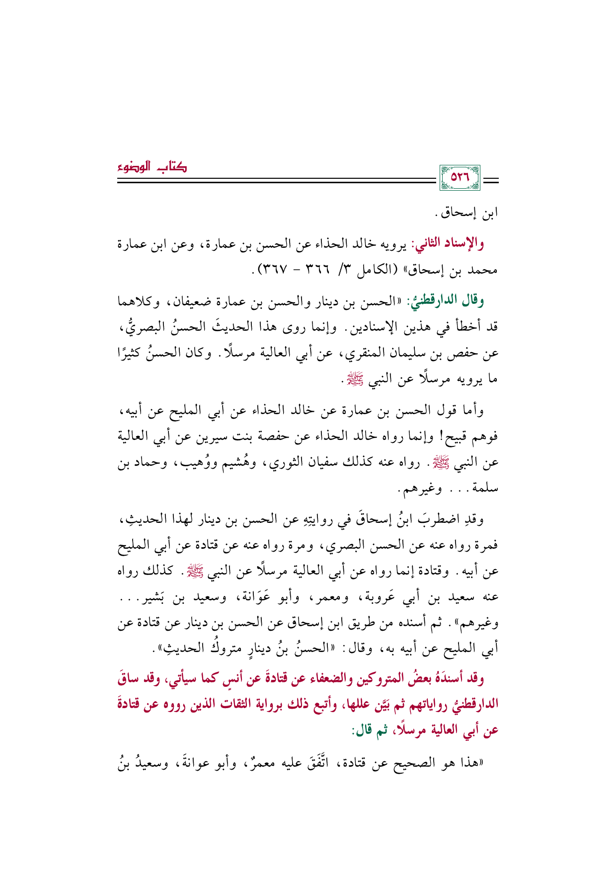 وأما قول الحسن بن عمارة عن خالد الحذاء عن أبي المليح عن أبيه، فوهم قبيح! وإنما رواه خالد الحذاء عن حفصة بنت سيرين عن أبي العالية عن النبي صلى الله عليه وسلم. رواه عنه كذلك سفيان الثوري، وهُشيم ووُهيب، وحماد بن سلمة ... وغيرهم.
