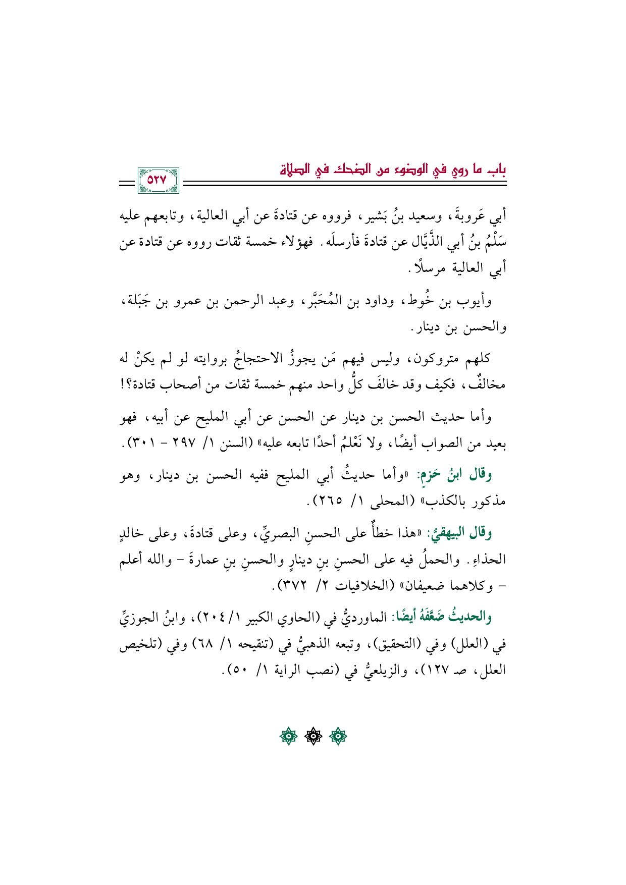 وقال البيهقيُّ: "هذا خطأٌ على الحسنِ البصريِّ، وعلى قتادةَ، وعلى خالدٍ الحذاءِ. والحملُ فيه على الحسنِ بنِ دينارٍ والحسنِ بنِ عمارةَ -والله أعلم- وكلاهما ضعيفان" (الخلافيات ٢/ ٣٧٢).