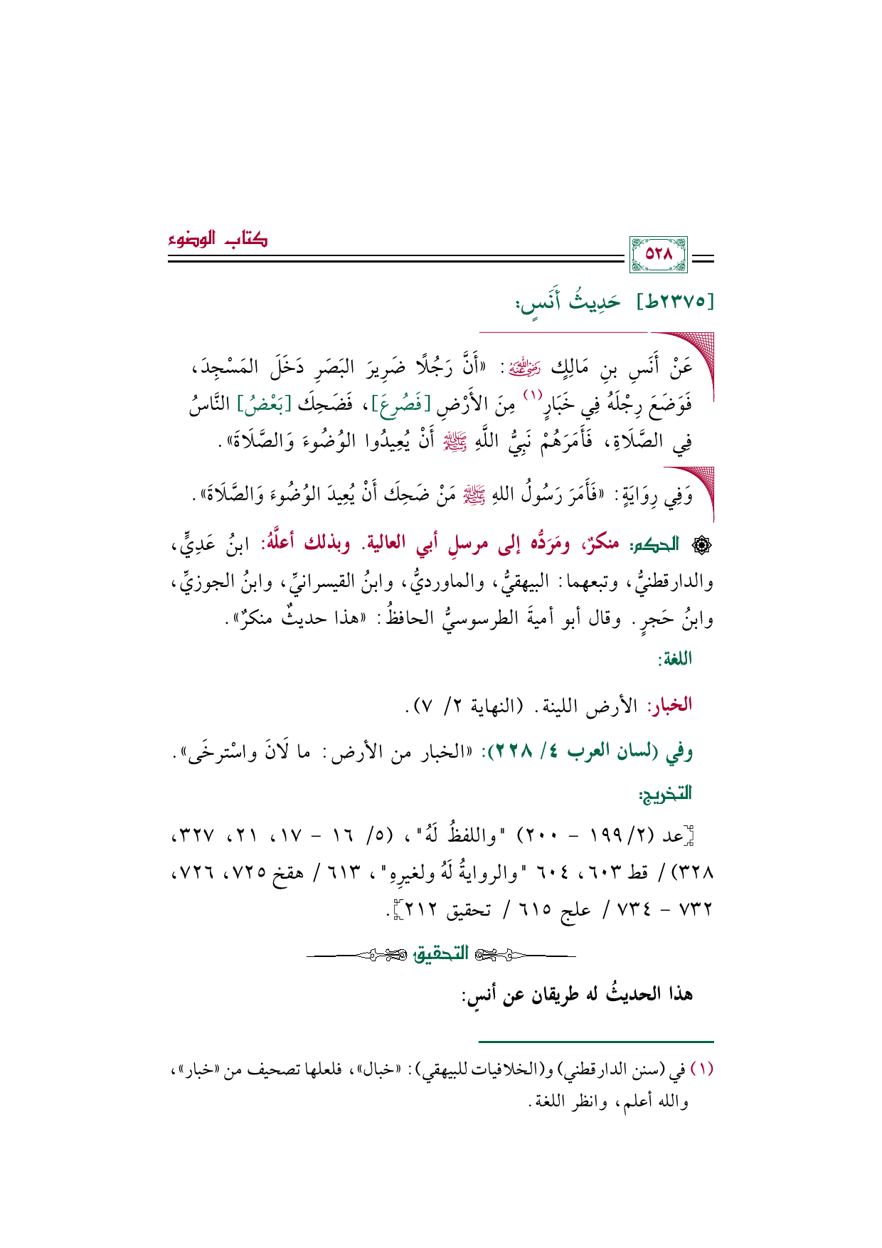 ◼ عَنْ أَنَسِ بنِ مَالِكٍ رضي الله عنه: ((أَنَّ رَجُلًا ضَرِيرَ البَصَرِ دَخَلَ المَسْجِدَ، فَوَضَعَ رِجْلَهُ فِي خَبَارٍ (¬١) مِنَ الأَرْضِ [فَصُرِعَ]، فَضَحِكَ [بَعْضُ] النَّاسُ فِي الصَّلَاةِ، فَأَمَرَهُمْ نَبِيُّ اللَّهِ صلى الله عليه وسلم أَنْ يُعِيدُوا الوُضُوءَ وَالصَّلَاةَ)).